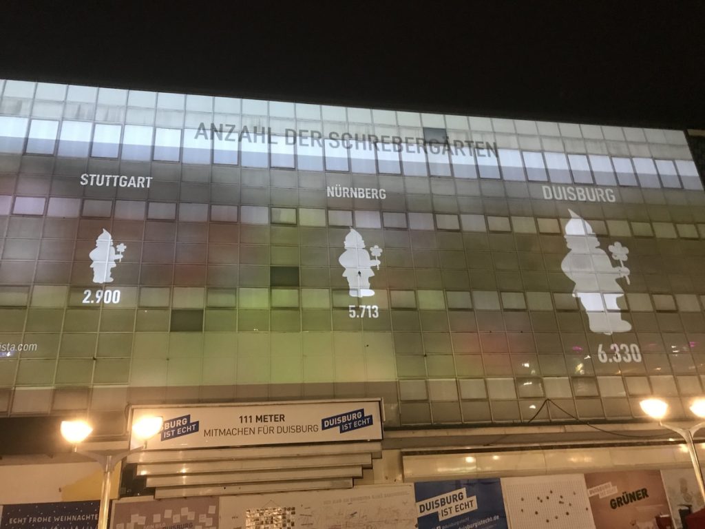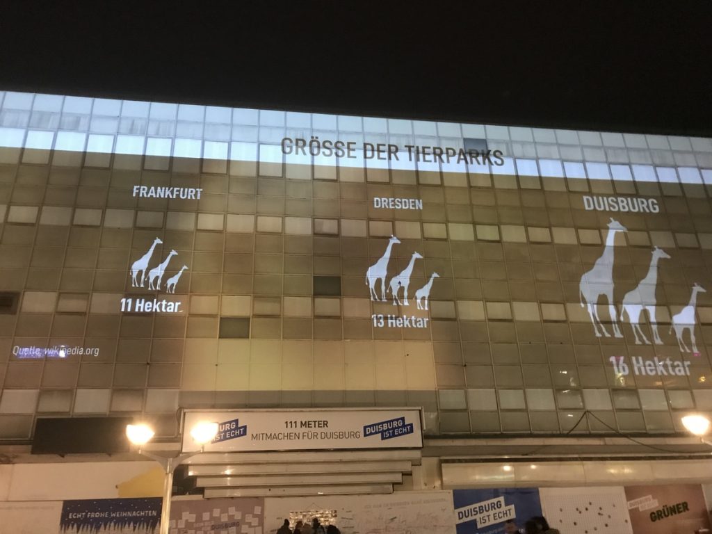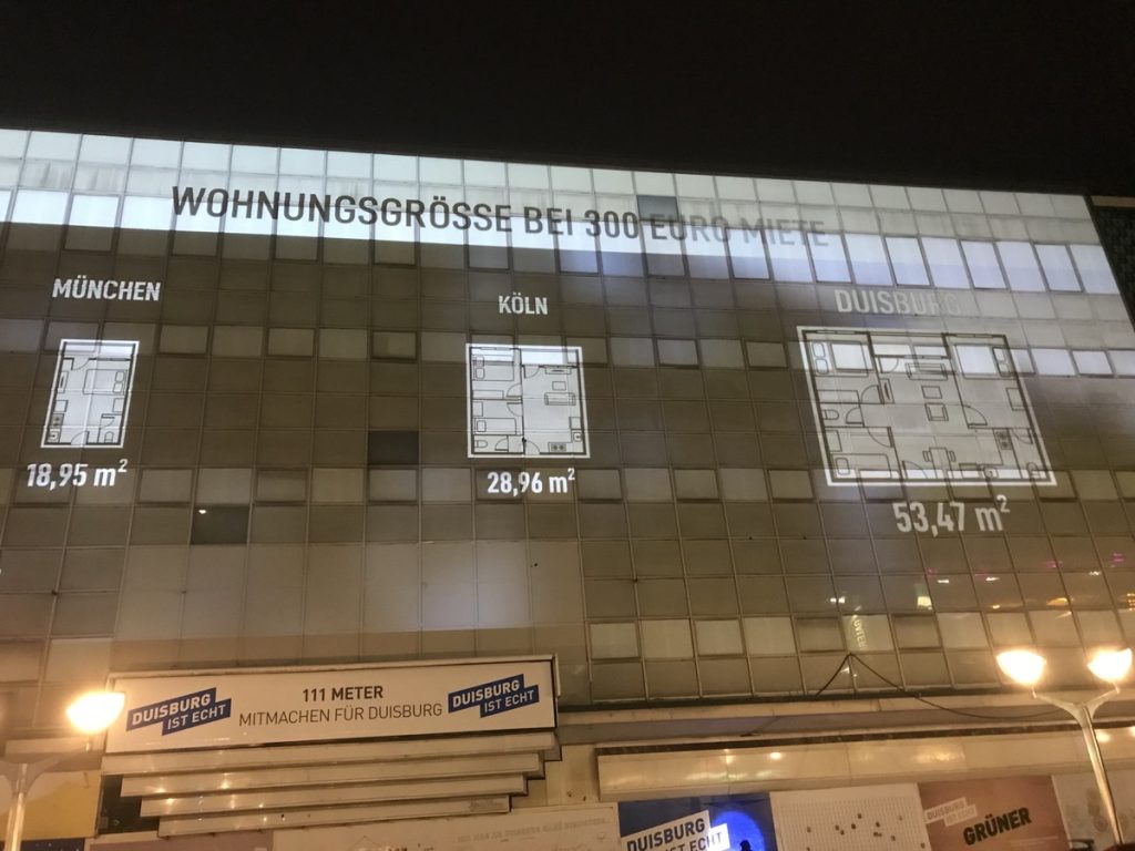 Andere Teile der Lichtinstallation sind einfach nur traurig: „Duisburg ist am aufblühen“ kann man dort lesen. Habe ich bei der Planung zum Multicasa im Jahre 2001 auch gehört. Das Projekt ist, wie viele andere auch, im Sande verlaufen. Wer nachts durch Duisburg läuft, sieht eine tote Stadt. Kein Vergleich zum Bermuda-Dreieeck in Bochum – oder Düsseldorf. Metropolen wie Stuttgart, Berlin oder München mag man gar nicht erwähnen. Es klingt ein wenig nach den Durchhalteparolen am Ende des zweiten Weltkriegs und nach purer Verzweiflung. Mit der Realität hat dieses Bild nichts zu tun.