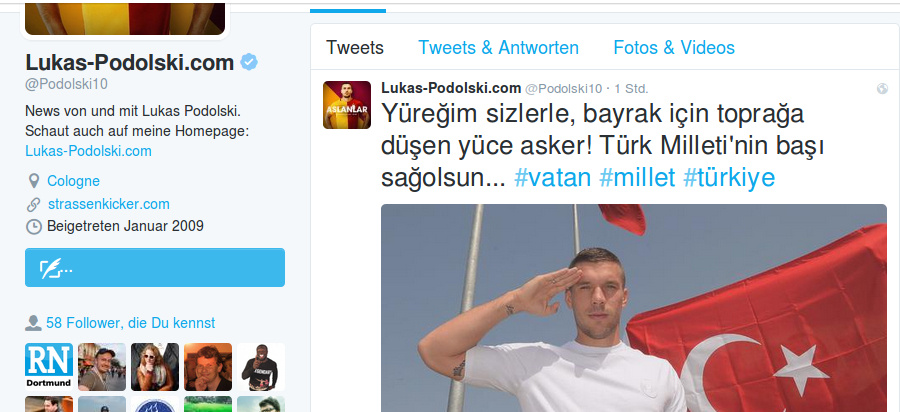 Schon wenige Wochen in der Türkei reichen Podolski allerdings zu einer kruden Identifikation mit dem türkischen Staat aus. Auf seinem Twitterprofil posiert der Fußballprofi vor einer türkischen Fahne. Dazu ein Text, der übersetzt bedeutet: „Mein Herz ist mit euch, die für die Fahne gefallenen türkischen Soldaten. Dem türkischen Volk mein Beileid.“ In einer Zeit, in der die Türkei in einen Bürgerkrieg zu rutschen droht, stellt sich Podolski also, ohne offensichtlichen Grund, auf die Seite der türkischen Armee. Einer Armee, die derzeit die Stadt Cizre belagert und dort Zivilisten tötet.