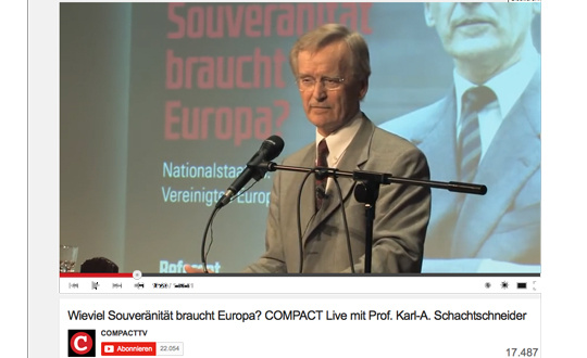 Auch der dritte Referent, Prof. Dr. iur. Karl-Albrecht Schachtschneider hat in der AfD Gewicht und galt lange als möglicher AfD-Kandidat für das Europaparlament. Er ist gern gesehener Redner bei Parteiveranstaltungen. Doch unterhält er nicht nur zur AfD beste Kontakte, sondern diskutierte gemeinsam mit Jürgen Elsässer die Frage, ob Deutschland überhaupt noch souverän ist. Elsässer widmete ihm außerdem unter dem Motto „Mut zur Wahrheit“ eine eigene Veranstaltung und veröffentlichte dessen Schrift über die Völkerrechtskonformität des Referendums auf der Krim.