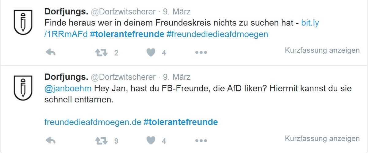 Mit der Aktion „Mach schluss[sic!] mit Freunden, die die AfD mögen!“ will die Kreativagentur Dorfjungs Facebook-Benutzer dazu anhalten, AfD-Unterstützer in der eigenen Freundesliste zu identifizieren und anschließend zu entfreunden. Dabei etablieren die Dorfjungs einen perfiden Mechanismus gegenseitiger Überwachung in sozialen Medien- und kompromittieren die öffentliche Meinungsbildung auf dem Marktplatz der Ideen.