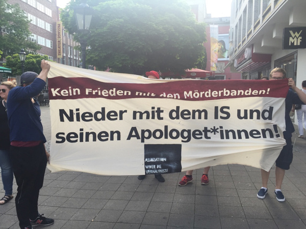 In der Nähe des Kinos fand eine kleine Protestkundgebung statt. Ca. 10 Aktivisten verteilten ein schlecht formatiertes Pamphlet, das sich las, als hätte der Verfasser zu viel Zwölftonmusik und zu wenig Jazz gehört. Von dem Banner „Nieder mit dem IS und seinen Apologet*Innen“ dürften sich nicht nur männliche cis-IS-Apoloteten, sondern auch weibliche, queere und gender-nonkonforme IS-Apologetinnen angesprochen gefühlt haben.