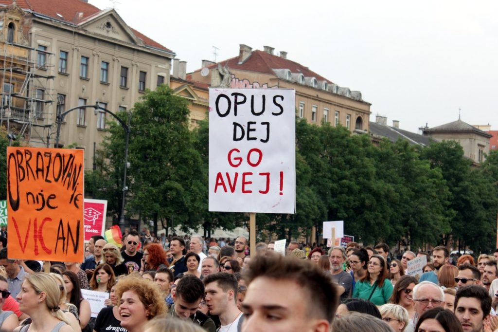 „Ne kaže se klerikulna reforma nego kurikuralna reforma“ steht auf einem der selbst gebastelten Schilder in der Menge. „Es heißt nicht Klerikularreform, es heißt Curricularreform.“