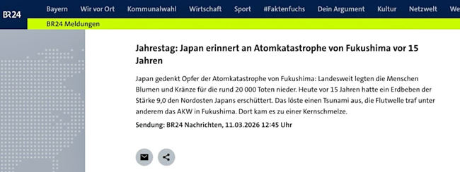 Am Tag nach der Falschmeldung schrieb der BR, er habe „die Abfolge der Ereignisse missverständlich dargestellt. Dadurch konnte der Eindruck entstehen, die 20.000 Todesopfer seien infolge der Reaktorkatastrophe ums Leben gekommen. Das ist falsch. Vielen Dank für Ihre Hinweise. Wir bitten den Fehler zu entschuldigen.“ Die neue Meldung (mit den falschen alten Angaben zu Datum und Uhrzeit) mit der Überschrift: „Japan gedenkt der Opfer von Fukushima“ ist nicht viel besser zusammengestoppelt: „Heute vor 15 Jahren hatte ein Erdbeben der Stärke 9,0 den Nordosten Japans erschüttert. Das löste einen Tsunami aus, die Flutwelle traf unter anderem das AKW in Fukushima. Dort kam es zu einer Kernschmelze. Landesweit legten die Menschen heute Blumen und Kränze für die Toten nieder. 20.000 Menschen waren infolge des Erdbebens gestorben.“