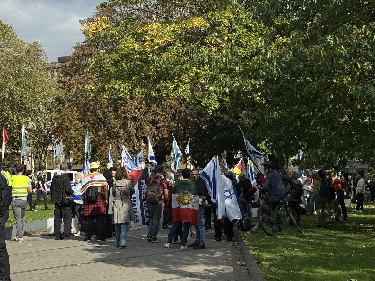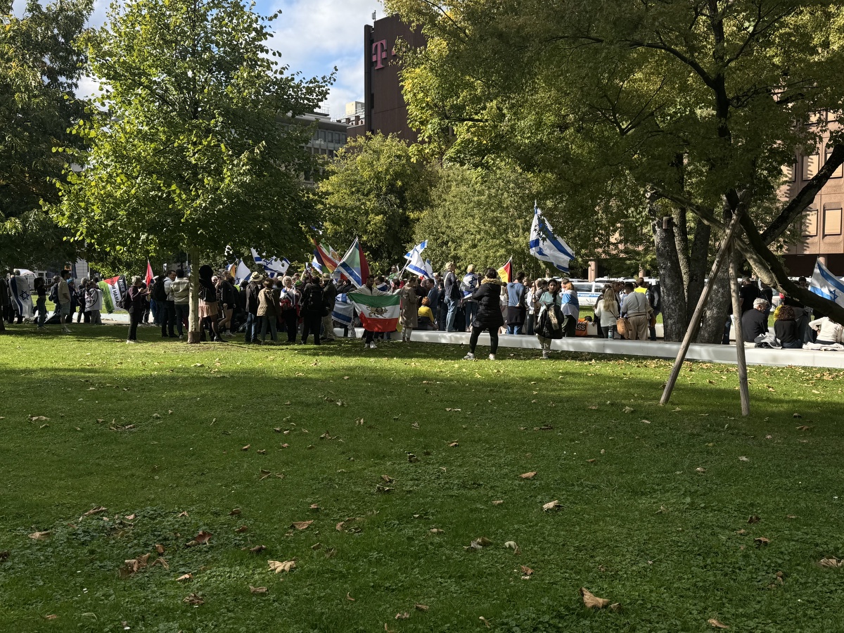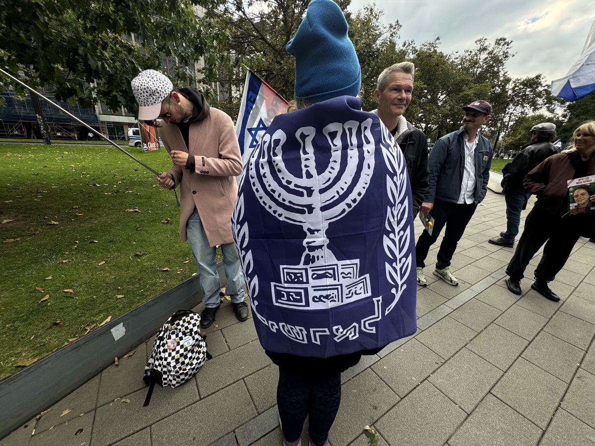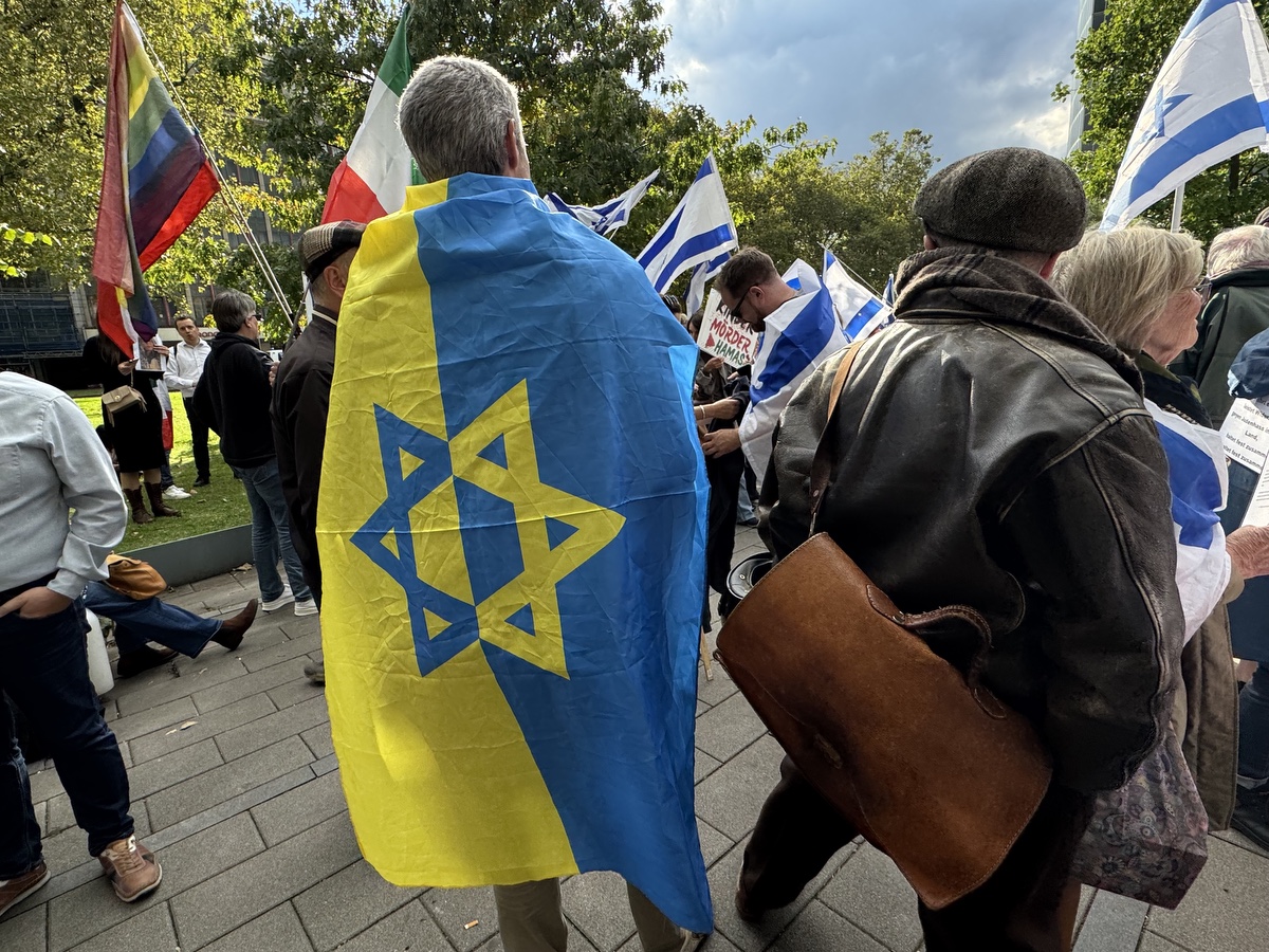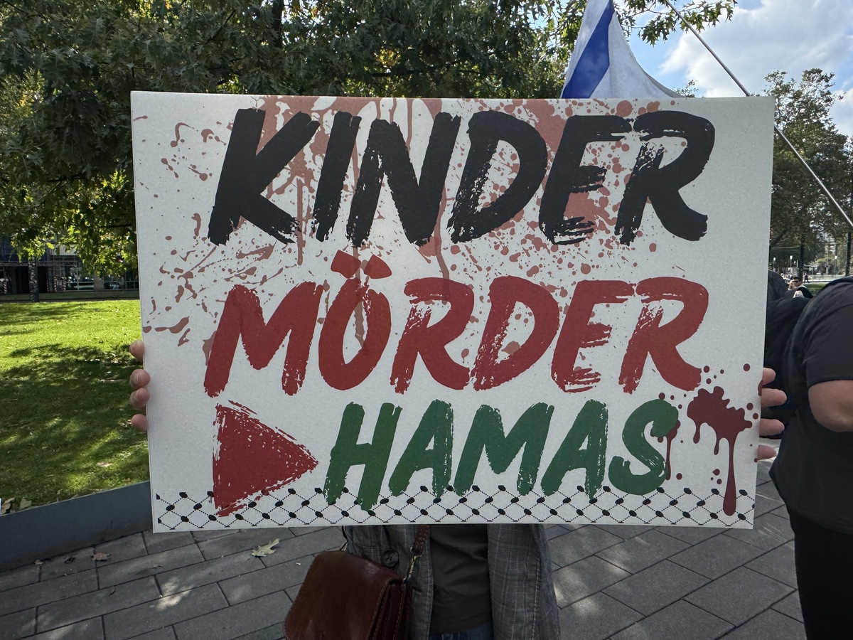Auf der kleineren Gegendemo erfährt man, wie sich David beim Kampf gegen Goliath gefühlt haben muss. Wobei die Sache damals für Goliath nicht gut ausging, was Hoffnung gibt. Die kleinere Truppe der Gegendemo begrüßt die Terror-Fans mit Sprechchören: „Wo sind die Geiseln?“ und „Free Gaza from Hamas!“ wird lautstark in Richtung der Demonstration skandiert.