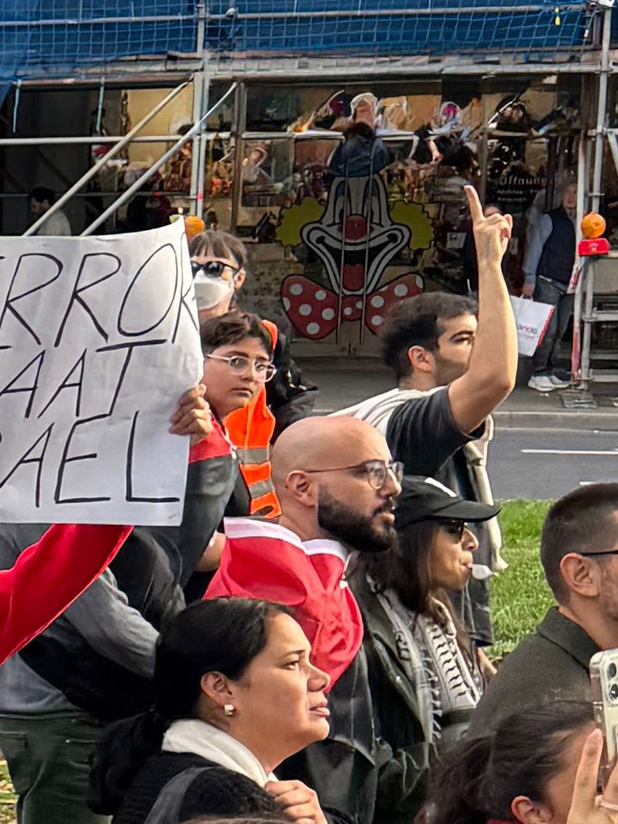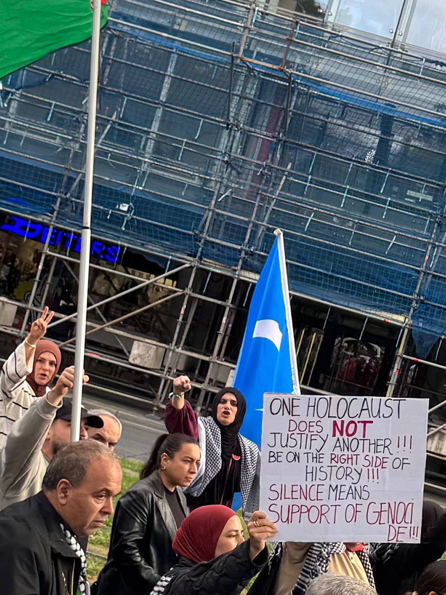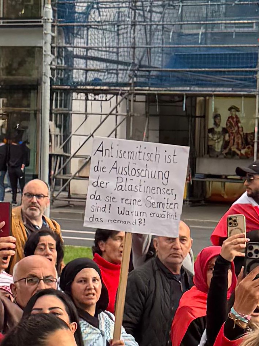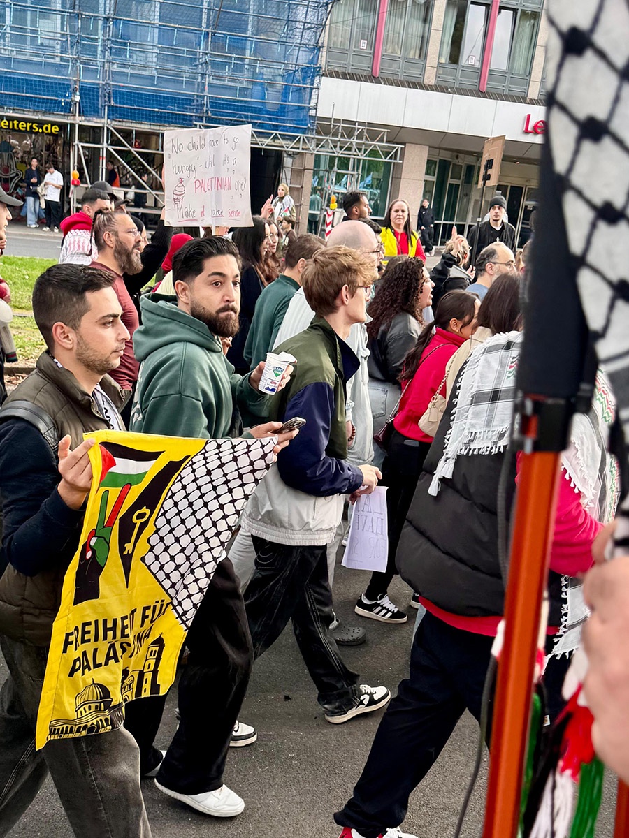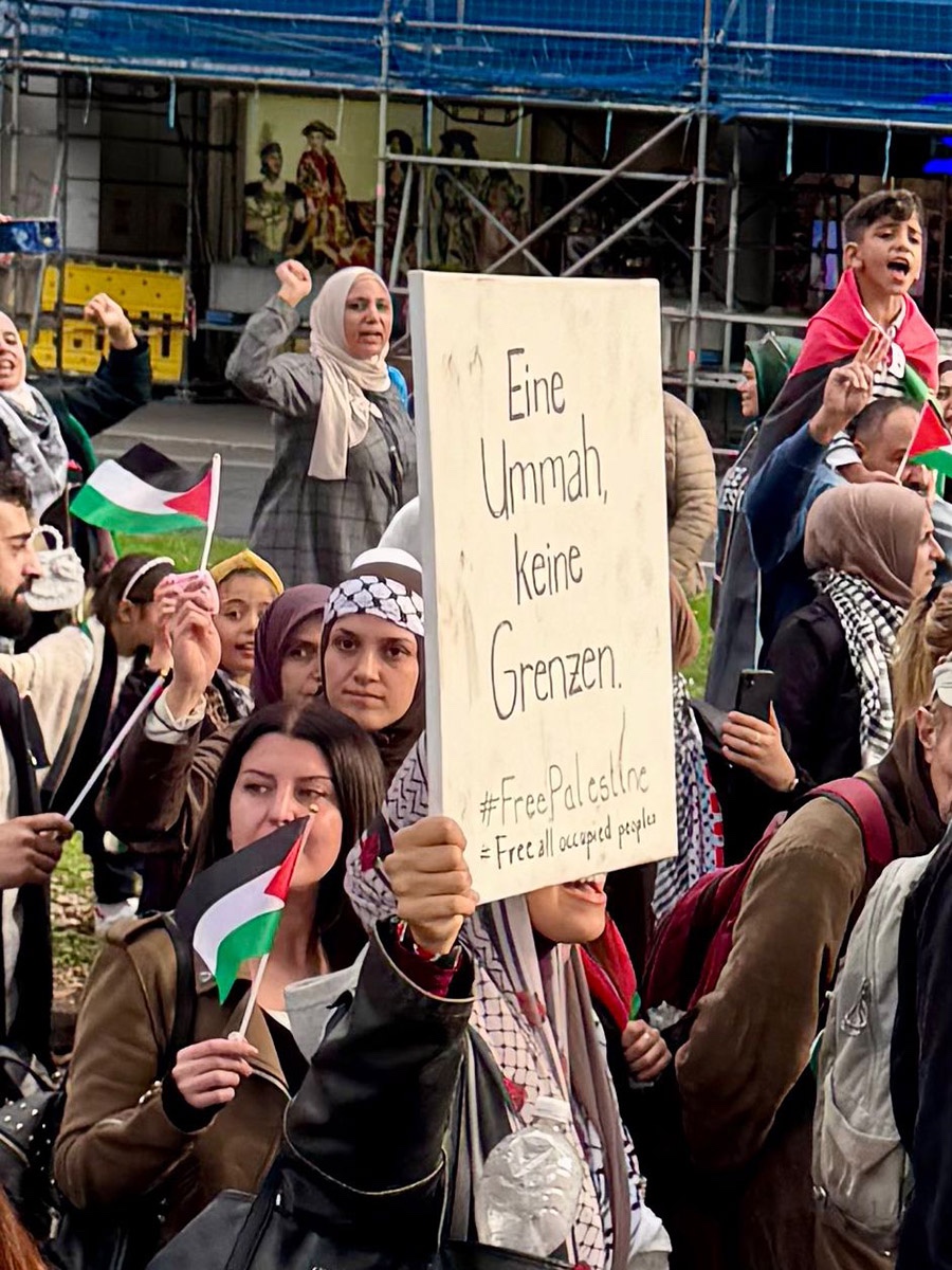 Auf der kleineren Gegendemo erfährt man, wie sich David beim Kampf gegen Goliath gefühlt haben muss. Wobei die Sache damals für Goliath nicht gut ausging, was Hoffnung gibt. Die kleinere Truppe der Gegendemo begrüßt die Terror-Fans mit Sprechchören: „Wo sind die Geiseln?“ und „Free Gaza from Hamas!“ wird lautstark in Richtung der Demonstration skandiert.