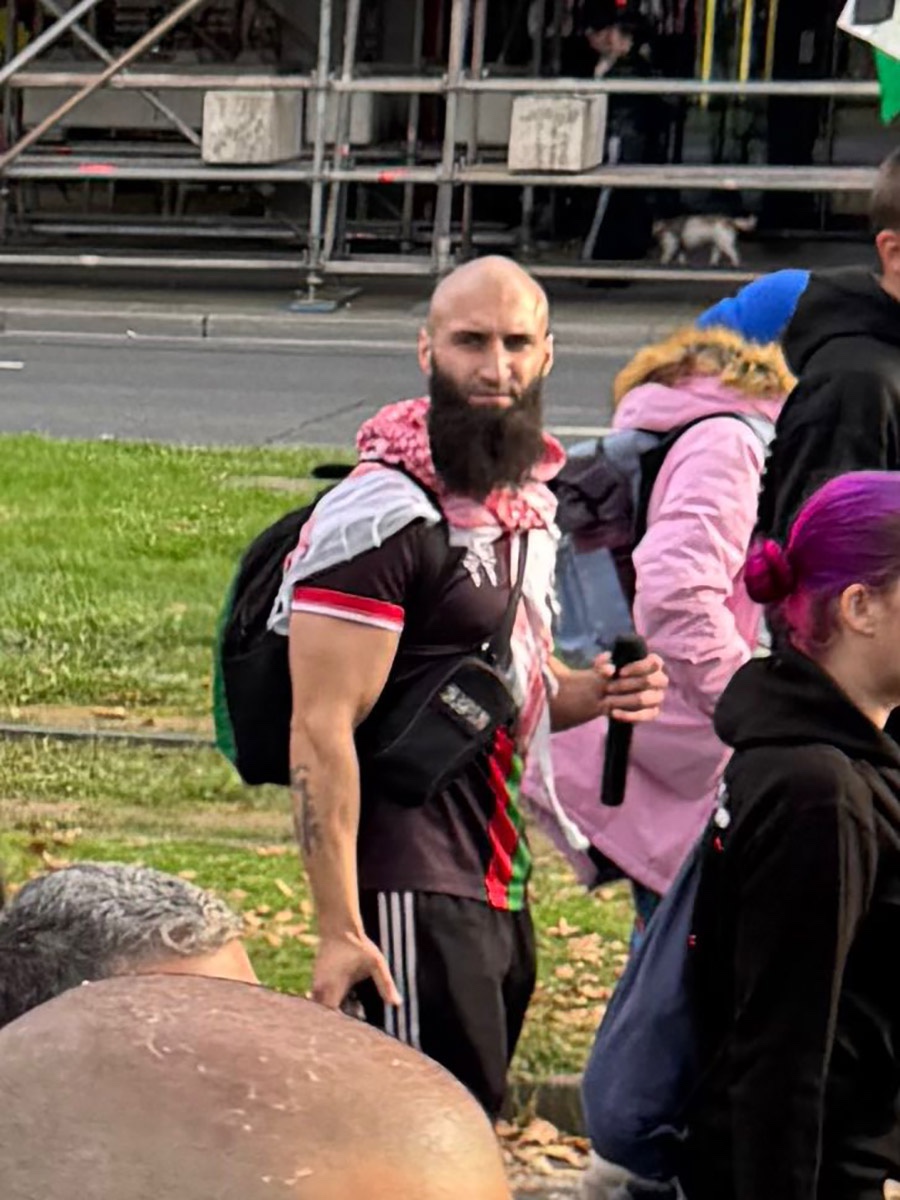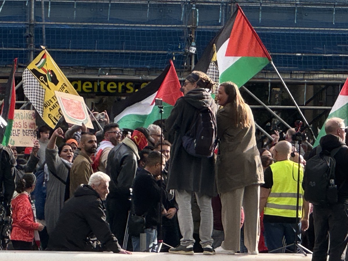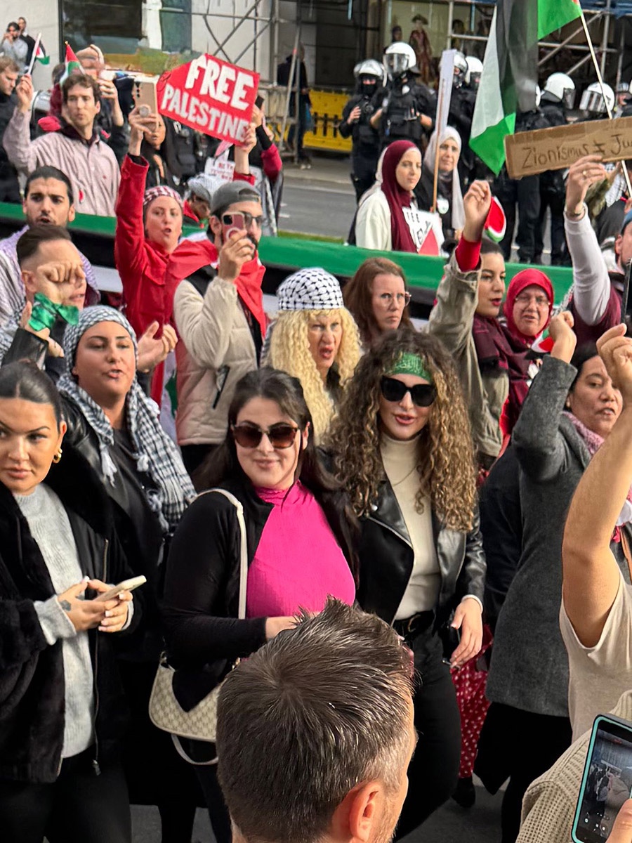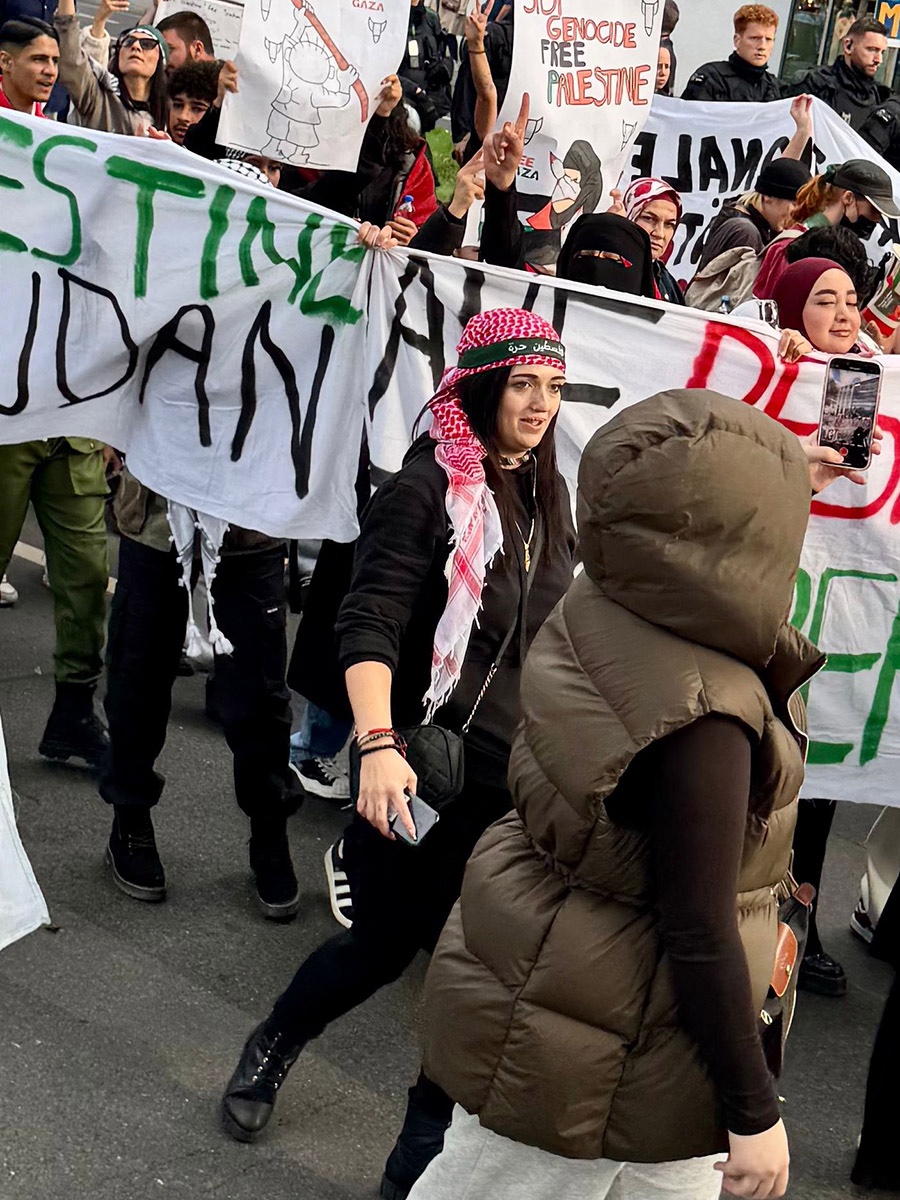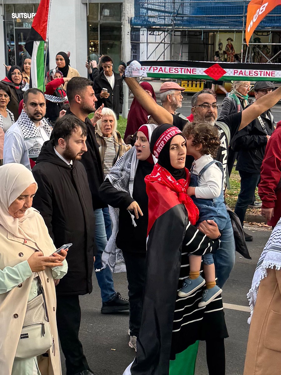 Auf der kleineren Gegendemo erfährt man, wie sich David beim Kampf gegen Goliath gefühlt haben muss. Wobei die Sache damals für Goliath nicht gut ausging, was Hoffnung gibt. Die kleinere Truppe der Gegendemo begrüßt die Terror-Fans mit Sprechchören: „Wo sind die Geiseln?“ und „Free Gaza from Hamas!“ wird lautstark in Richtung der Demonstration skandiert.