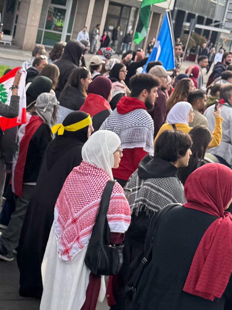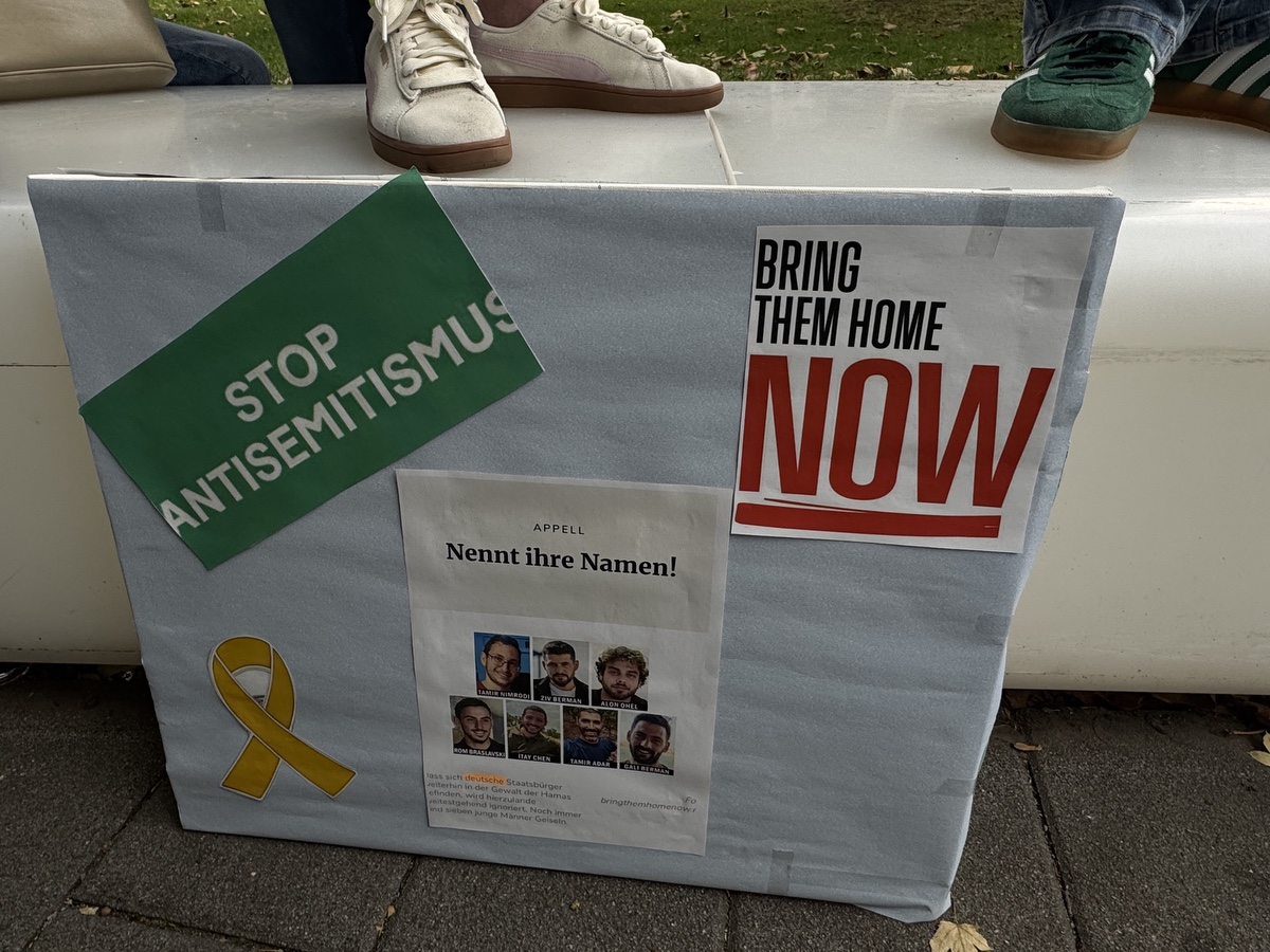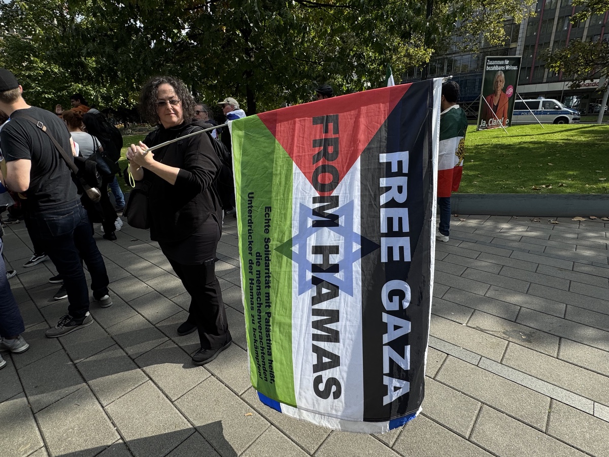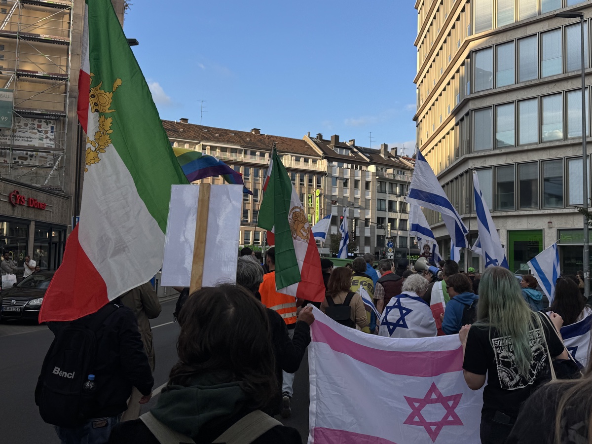 Die anderen Redebeiträge waren wohl nicht besser. Zeitgleich trafen immer mehr Menschen bei der Gegendemo ein. In der Spitze habe ich etwa 160 Teilnehmer gezählt. Viele kenne ich von den Run-for-their-Lives-Spaziergängen in Düsseldorf. Auf Transparenten, Flaggen und Schildern wird auf das Schicksal der Geisel, darunter auch mehrere deutsche Staatsbürger, hingewiesen. Viele Exiliraner haben die alten iranische Staatsflaggen dabei und Schilder, auf denen das islamistische Terrorregime in Teheran kritisiert wird. Es gibt Redebeiträge: Der Angriff der Hamas, die sexualisierte Gewalt der Islamisten und die Geiseln stehen im Mittelpunkt.