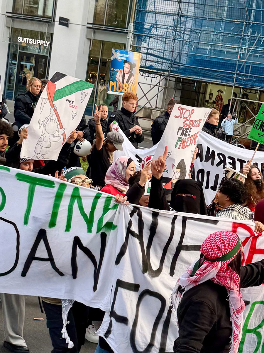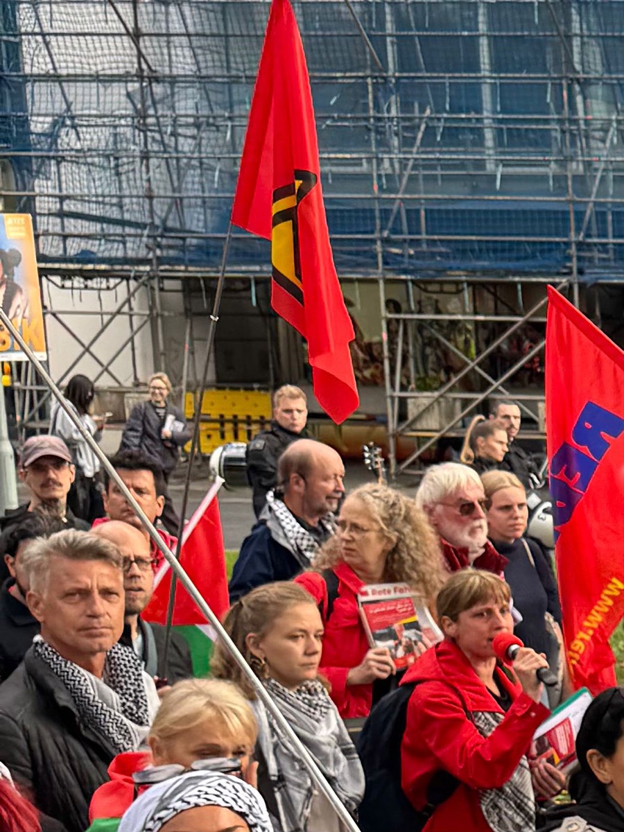 Es dauert, weil sich der Abmarsch der Islamistentruppe wegen des voranfahrenden Motorradkorsos verzögert hat, eine Weile, bis der Demonstrationszug den Graf-Adolf-Platz passiert. Um 16:20 Uhr erscheinen die ersten Polizeiwagen und ein Wasserwerfer, der nicht zum Einsatz kam. Anschließend folgt der Demonstrationszug. Palästina-Flaggen machen den Großteil der Demonstration aus. Flaggen der MLPD und anderer linker Splittergruppen sind, neben Fahnen, auf denen das Konterfei Ché Guevaras zu sehen ist, zu sehen. Auf Schildern stehen Fake-News zu Israel und zum Genozid. Das, was zu erwarten war. Die Demonstration wird live nach Gaza übertragen, was ohne Hamas-Verbindungen kaum möglich wäre. Das Internet in Gaza scheint intakt zu sein.