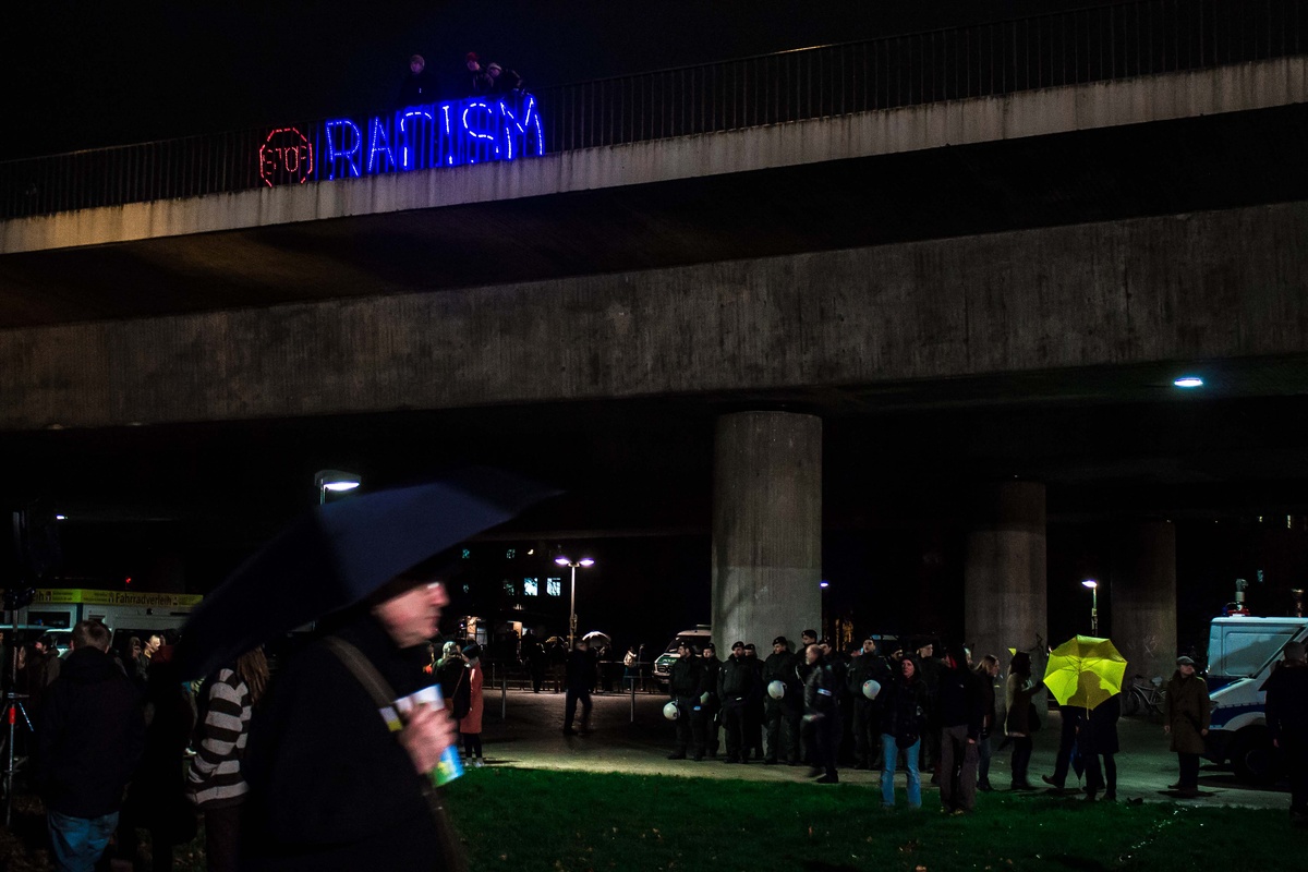 Noch vor der Dügida-Kundgebung fanden zwei Gegenkundgebungen statt. Unter der Rheinkniebrücke versammelten sich Antifa-Gruppen zusammen mit Mitgliedern von Attac, V.v.N. B.d.A. und Linkspartei. Ca. 350 Menschen kamen trotz des andauernden Nieselregens zusammen. Ein Sprecher vom V.v.N. B.d.A. betonte, dass man die andere Gegenkundgebung dulden und nicht zeitgleich Reden halten wolle. Auch ein paar Mitglieder der PARTEI waren anwesend.