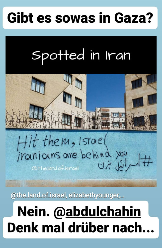 In der unmittelbar darauffolgenden Story hatte ich ein Bild von Pro-Israel-Graffities aus dem Iran: