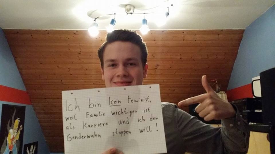 Dazu heißt es: „Die Jugendorganisation der SPD hat eine Aktion gestartet, bei der sie Sprüche in der Hand hielten wie etwa: „Ich bin Feminist, denn wer die menschliche Gesellschaft will, muss die männliche überwinden“. Da wir uns „Vernunft statt Ideologie“ auf die Fahnen geschrieben haben, konnten wir dies nicht so im Raum stehen lassen. Deshalb zeigt die Junge Alternative Gesicht gegen verstaubte linke Ideologien!“