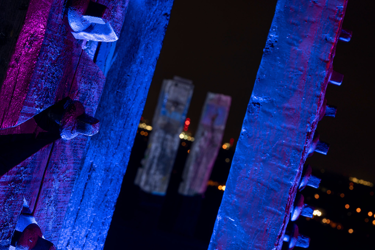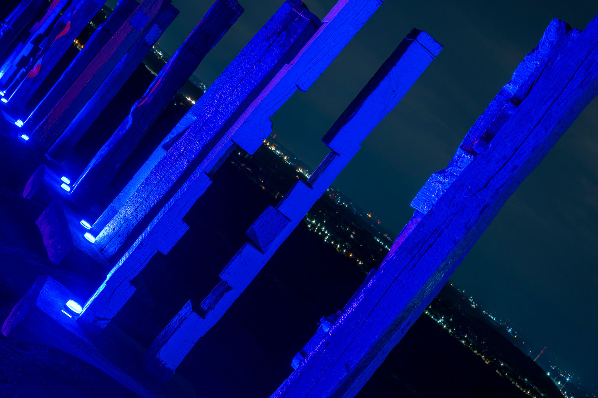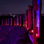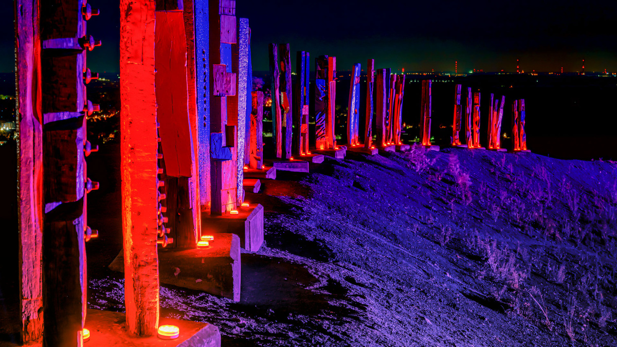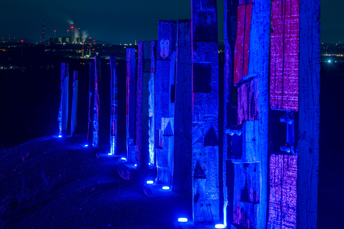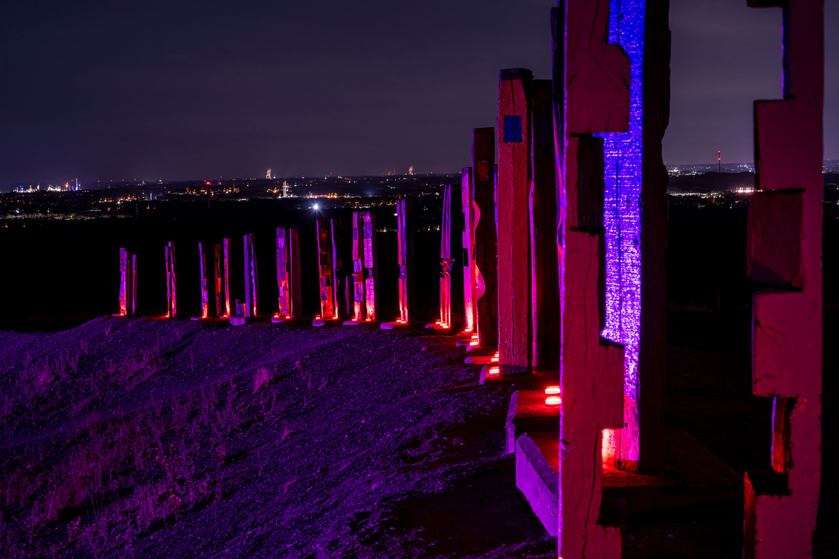 Nach einem Pilotprojekt auf der Halde Norddeutschland, bei der wir das Hallenhaus illuminiert hatten, war nun diesmal unser großes Ziel, die Totems auf der Halde Haniel zu beleuchten. Eine ungleich viel größere Herausforderung.