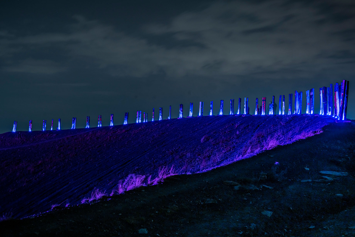 Über 100 LED Lampen (eine Lampe pro Totem) und zwei Leistungsstarke Movinglights beleuchteten die Halde. Die Totems strahlten wie noch nie zuvor. Die Programmierung erfolgte mit einem Lichtpult. Alle Scheinwerfer wurden per Akku betrieben. Für die Movinglights hatte ich extra ein 230V Akkupack besorgt statt eines Dieselaggregates, welches uns 8 Stunden mit Strom versorgte. Das nennt sich dann glaube ich «nachhaltiger» als Aggregate, zumal die Akkus in der Schweiz geladen wurden.