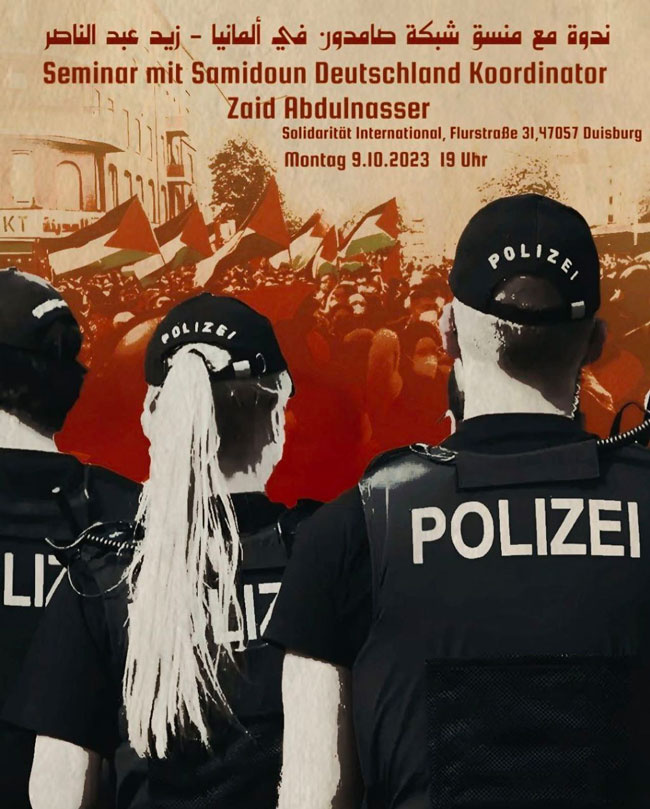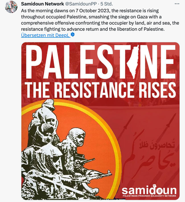 Samidoun ist eine den palästinensischen Terroristen nahestehende Organisation. Sie sind eng mit der Volksfront zur Befreiung Palästinas (PFLP) verbunden. Die aktuellen Terrorangriffe auf Israel werden von Samidoun bejubelt: Die Mörderbanden, die zurzeit in Israel Kinder, Frauen und Alte umbringen, sind für sie Freiheitskämpfer.