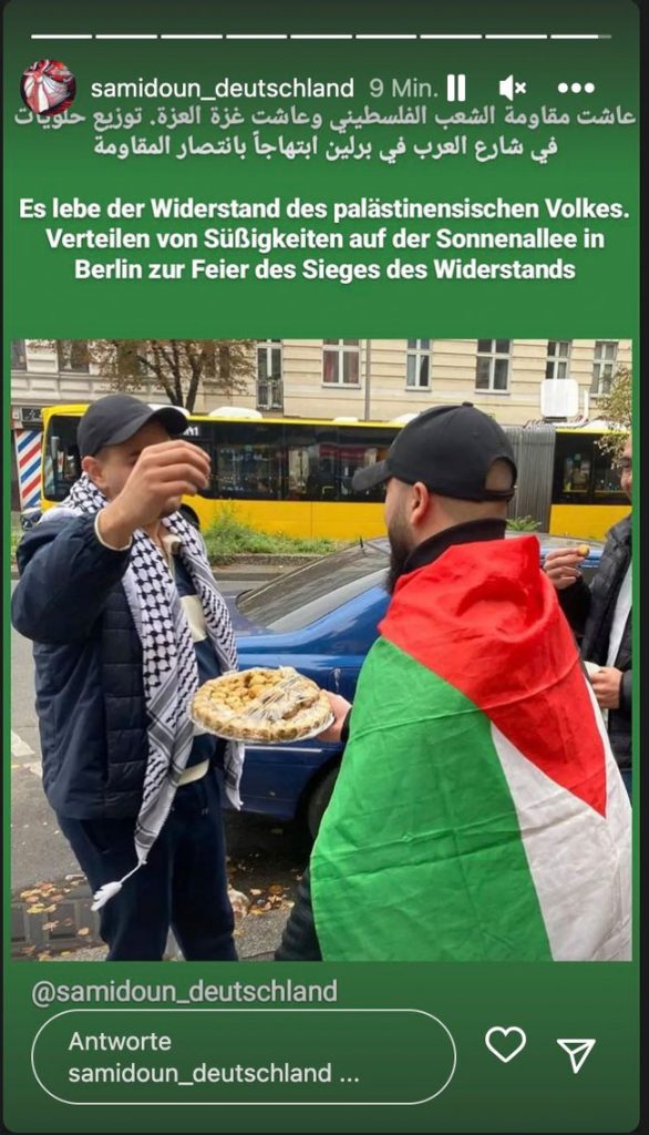 In Berlin-Neukölln verteilten heute ihrer Mitglieder Süßigkeiten aus Freude über den Mord an Juden: