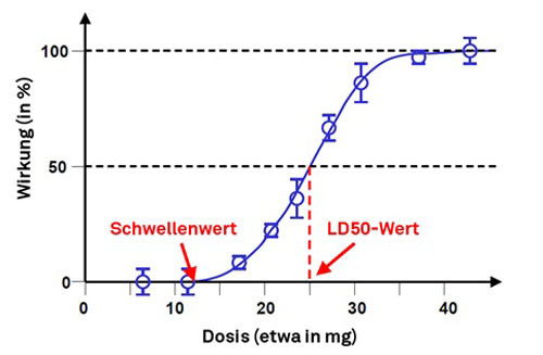 Die Quantifizierung dieser Dosis-Wirkungs-Beziehung geschieht heute mittels fortgeschrittener Methoden der mathematischen Statistik. Die folgende Grafik gibt eine solche idealtypische Dosis-Wirkungs-Kurve wieder. Auf der waagerechten Achse ist dabei die Menge, auf der senkrechten Achse die Wirkung abgetragen. Der LD50-Wert bezeichnet dabei diejenige Schwelle, bei der in Tierexperimenten 50% der untersuchten Tiere sterben.