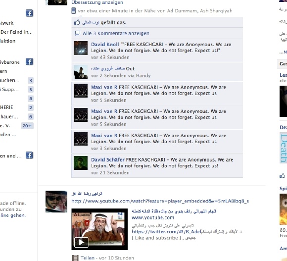 Sie geifern, sie fordern seinen Tod – über 25.000 Mitglieder hat die Gruppe ”Das saudische Volk will die Bestrafung von Hamsa Kaschgari”. Der Blogger und Journalist Hamsa Kaschgari hatte via Twitter an Mohammed gezweifelt. Nun wurde er von Malaysia nach Saudi Arabien ausgeliefert, wo ihm die Todesstrafe droht. Doch die Hetzer bestimmen nicht mehr alleine das Bild der Facebook-Site. Anonymus hat die Site gehackt und jetzt steht dort immer öfter: „FREE KASCHGARI – We are Anonymous. We are Legion. We do not forgive. We do not forget. Expect us!“