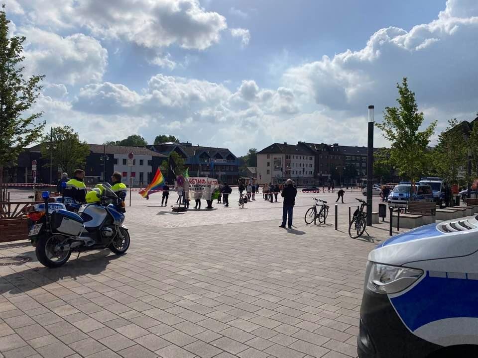 Von 8.30 Uhr bis 12 Uhr sollte die Demo laut Polizei und Lokalzeitung auf dem Marktplatz stattfinden. Als wir zwischen 9.30 und 10 Uhr vor Ort waren, da waren es vielleicht gerade noch gut 50 Personen, die da auf dem vergleichsweise riesigen Marktplatz, der rundherum mit Flatterband abgegrenzt war, auf Seiten der Anti-AfD-Demo ausharrten.