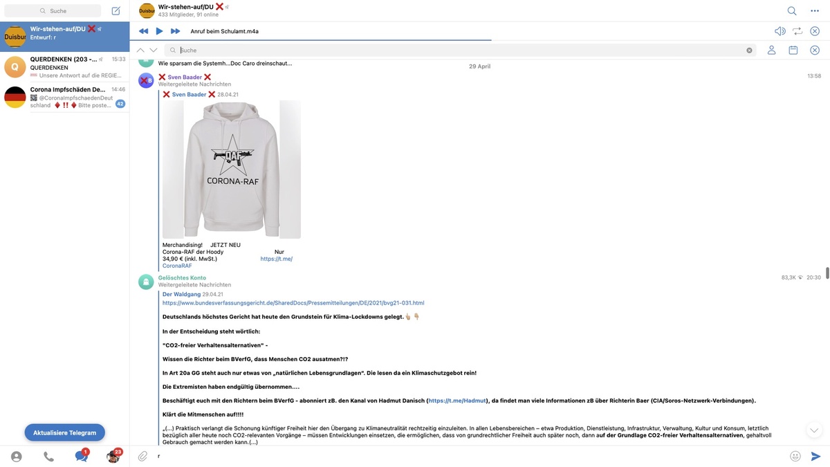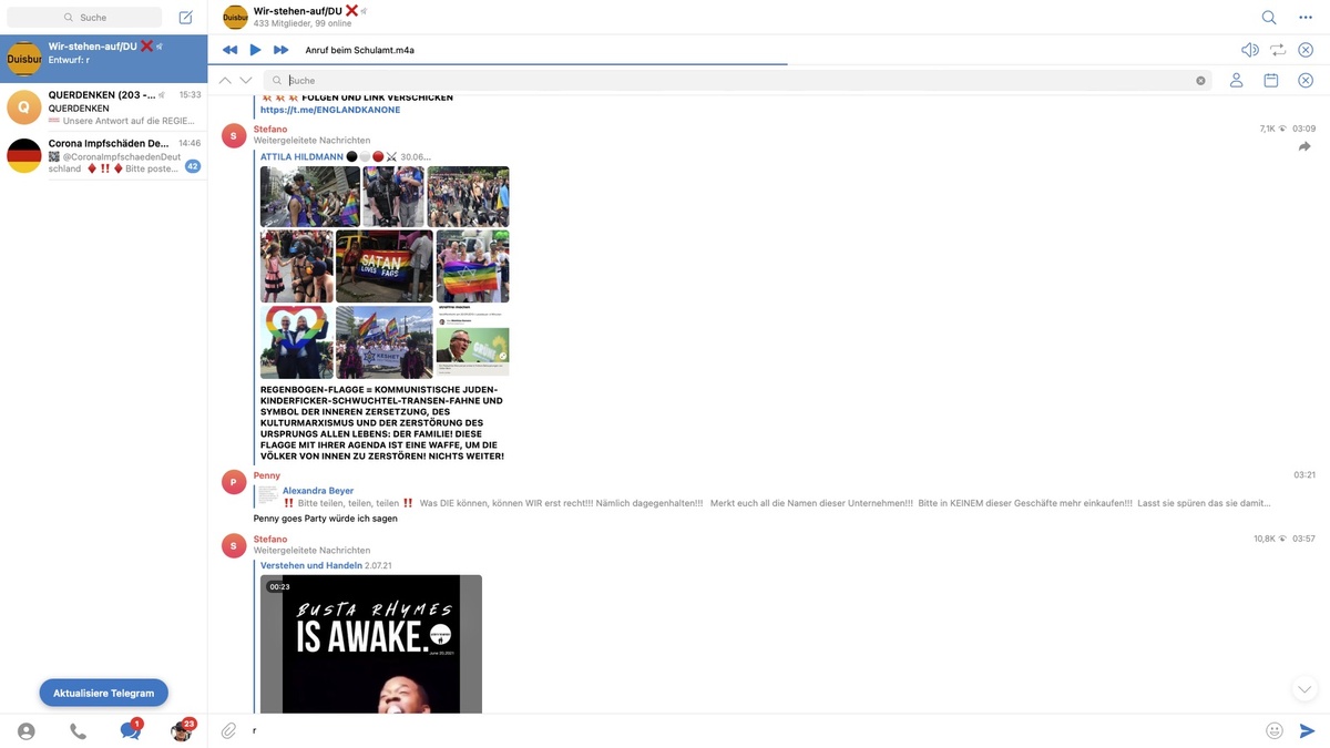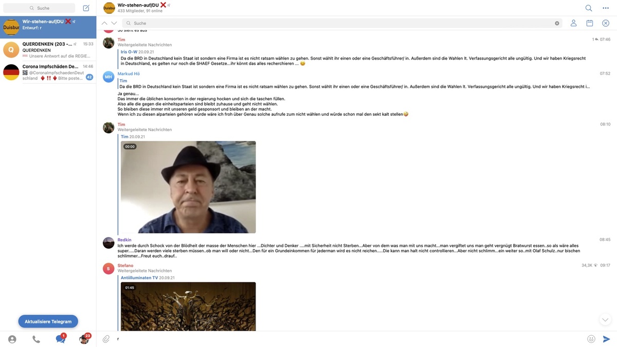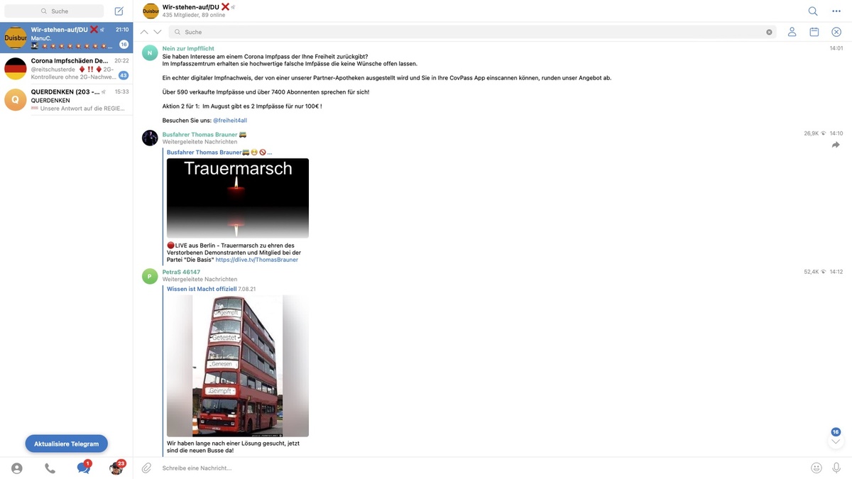 Gestern Abend wollte ich kurz auf diesen Kommentar antworten, hab mir zu diesem Zweck nochmals kurz – exakt 19 Minuten lang – Anfertigung von Screenshots inbegriffen- den Telegram-Kanal von „Duisburg steht auf“ angeschaut.