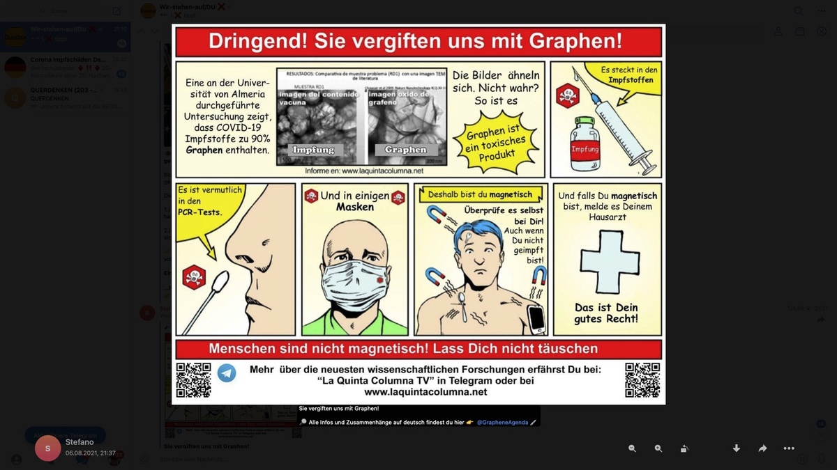 Aktueller, aber genauso irreführend wie das Video von Naomi Seibt, ist ein Beitrag in dem behauptet wird „dass COVID-19 Impfstoffe zu 90% Graphen enthalten“ (Screenshot). Auch diese Behauptung ist pure Desinformation.