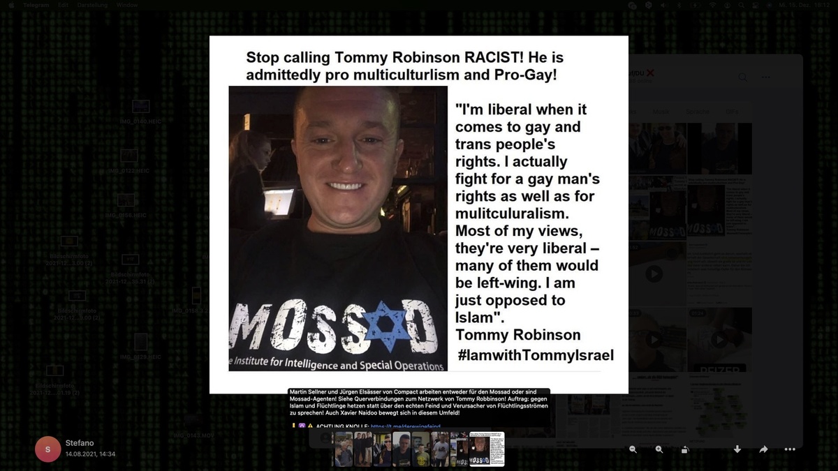 Ansonsten: Martin Sellner, Jürgen Elsässer und Tommy Robinson werden der Mitarbeit für den israelischen Auslandsgeheimdienst Mossad verdächtigt (Screenshot).