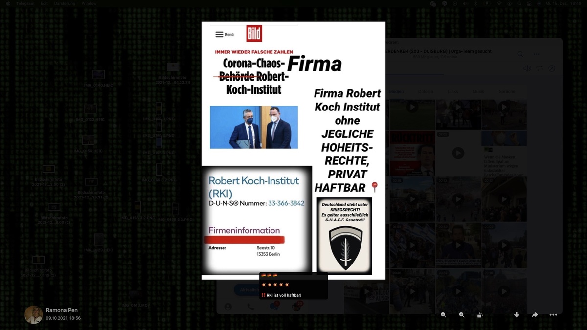 Passend dazu, teilt Gruppenmitglied Ramona Fake-News aus dem inzwischen gesperrten (Der Betreiber ist mittlerweile in Haft!) Telegram-Kanal SHAEF – Regierungsinstitution Deutschland: „Firma Robert Koch Institut ohne JEGLICHE HOHEITSRECHTE, PRIVAT HAFTBAR“ (Screenshot). Die gleiche Nutzerin mit dem Telegram-Nick „Ramona Pen“ teilt außerdem sehr viele Inhalte (Screenshot) zur QAnon-Verschwörungstheorie.