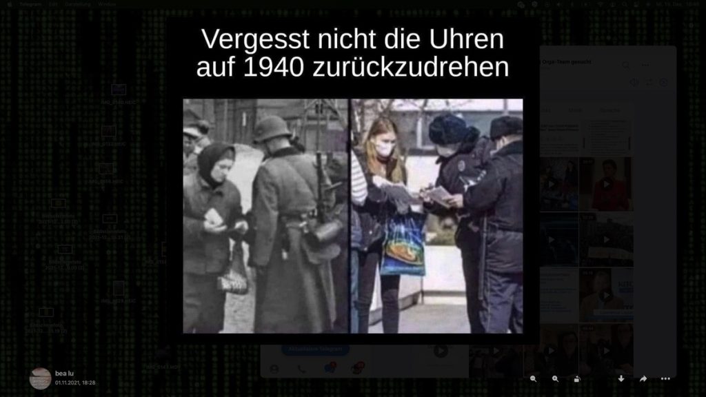 Fake-News, die Bewerbung von illegalen Impfausweisen, Nazivergleiche, Falschinformation und extremer Antisemitismus werden in dieser Gruppe toleriert.