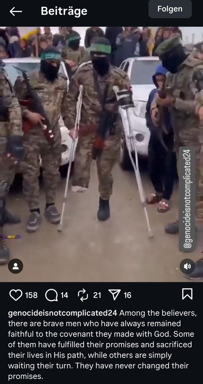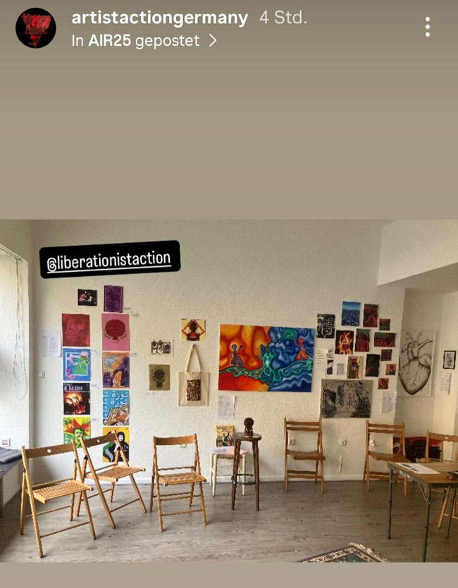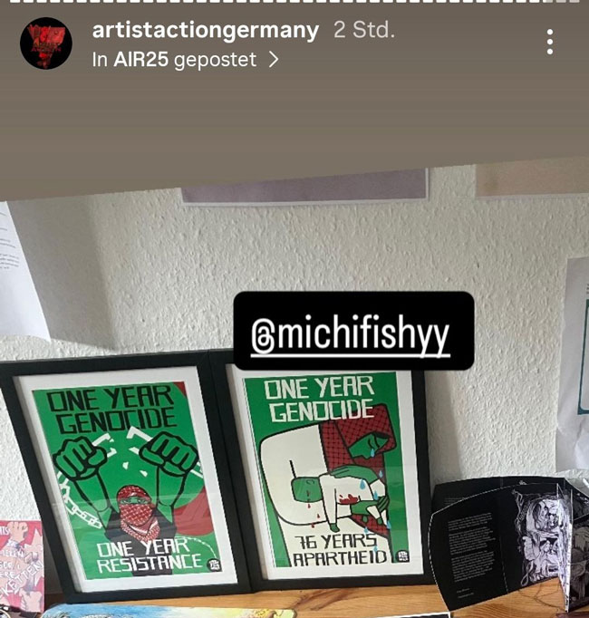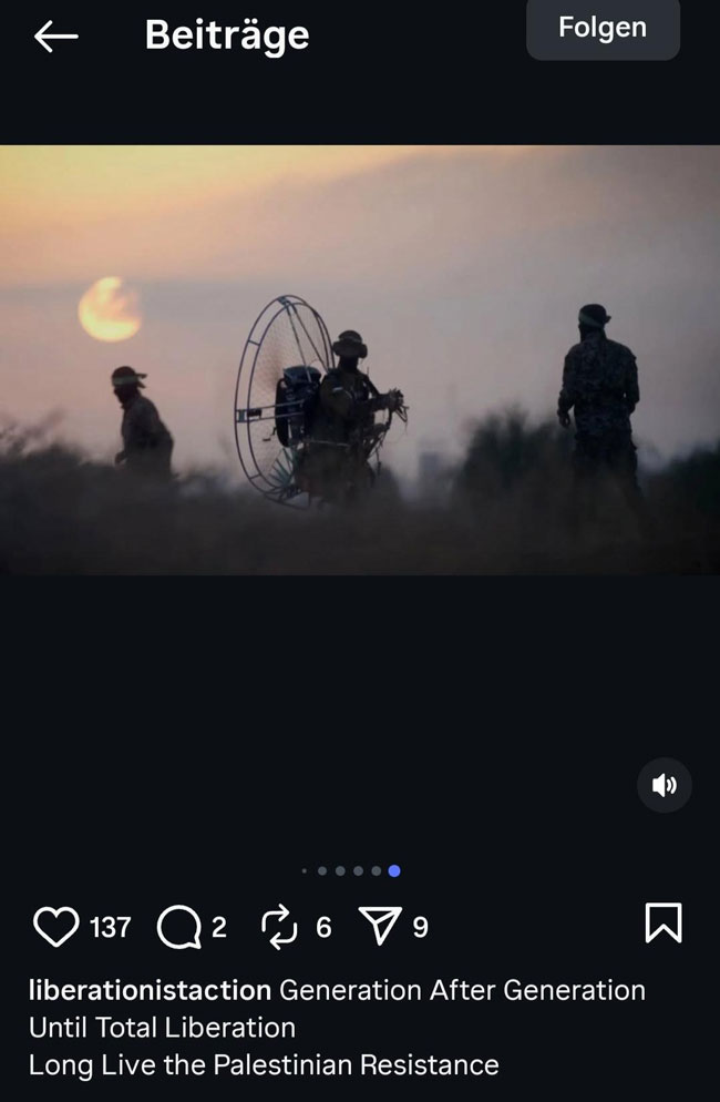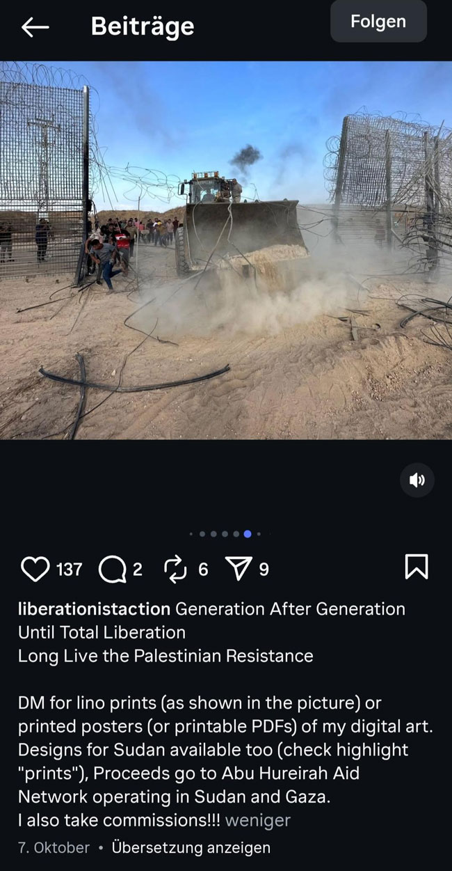 Schockierend ist dagegen, wie wenig Berührungsängste dieses „anti-koloniale“ Kunstmilieu mittlerweile mit Personen hat, die sich positiv auf Pogrome gegen Jüdinnen und Juden beziehen und öffentlich Terrorismus feiern. Neben dem Artist „Abu Migrantifa“, der im letzten Artikel erwähnt wurde, gilt dies mindestens noch für eine weitere der ausstellenden Personen. Die Ausstellung im Rekorder II beherbergte nämlich auch mehrere Bilder des Artist „Liberation is action“. Dieser macht aus seinem Hass auf Israel und seine Bewunderung für die Hamas und den 7. Oktober keinen Hehl. Am zweiten Jahrestag des 7.Oktobers postete er auf seinem Instagram-Profil etwa Bilder vom Terroranschlag auf Israel. Auf einem Bild sind Hamas-Terroristen zu sehen, die mit Paraglidern die Grenze nach Israel überwunden haben. Auf einem anderen Bild, wie ein Bulldozer einen Grenzzaum zwischen Israel und Gaza einreißt und dutzende palästinensische Terroristen und Zivilisten nach Israel eindringen, um zu morden, zu demütigen, zu vergewaltigen. Der Künstler schreibt dazu lapidar: „Long live the palestinian resistance.“ Mit vier Herzen wird der Beitrag von einem Profil kommentiert, welches Hamas-Terroristen als mutige Männer bezeichnet, die unter den Gläubigen als einzige ihrem Bund mit Allah treu geblieben sind. Die Gleichzeitigkeit, dass die ausstellenden Artists sich selbst als Kämpfer für Gleichheit und Gerechtigkeit ansehen, während sie den Mord an unschuldigen Zivilisten und Kindern und unzählige Fälle von sexualisierter Gewalt an Jüdinnen und Juden feiern, ist bemerkenswert wie schockierend.