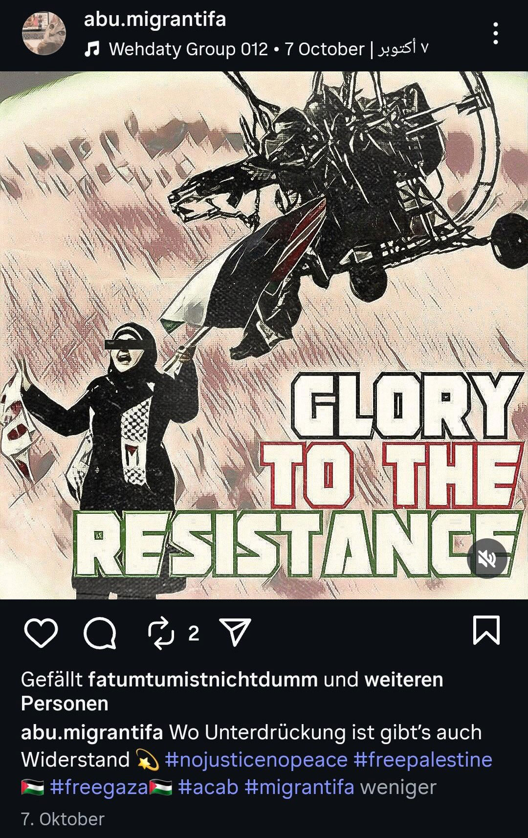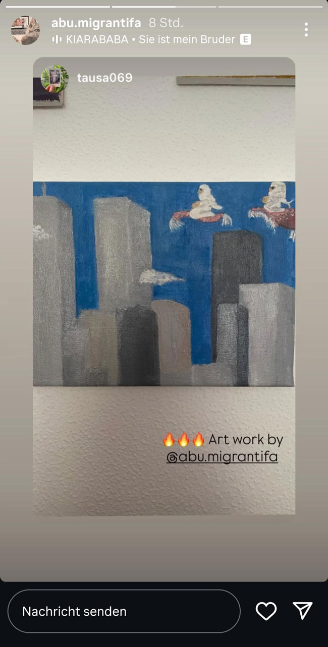 In der Ausstellung waren zum Beispiel Bilder eines „Künstlers“ zu sehen, der sich auf Instagram selbst „Abu Migrantifa“ nennt. Auf seiner Instagram-Seite finden sich zahlreiche Bilder, die Terrorismus verherrlichen und Antisemitismus verbreiten. Zumindest teilweise waren diese Bilder auch in der Ausstellung im Rekorder II zu sehen. In einem seiner Werke ist zum Beispiel einer der Paraglider abgebildet, mit denen Hamas-Terroristen die Grenze nach Israel überwunden haben, um am 7. Oktober über 1200 Menschen bestialisch zu ermorden, 240 Geiseln in den Gazastreifen zu verschleppen und über 5400 Menschen teilweise schwer zu verletzten. Aus seiner Verherrlichung des Pogroms macht er keinen Hehl, lapidar findet sich auf dem Bild der Schriftzug „glory to the resistance“. In anderen Bildern verwendet er rote Hamas-Dreiecke, mit denen die Hamas in Propagandavideos israelische Angriffsziele markiert. „Abu Migrantifa“ nutzt sie, um Raketenangriffe auf zivile Gebäude in Tel Aviv oder Gewalt gegen die deutsche Polizei zu glorifizieren. In einem anderen perfiden Bild, was mutmaßlich auch bei der Ausstellung in Dortmund gezeigt wurde, sind die Türme des World Trade Centers abgebildet, auf die zwei Personen in weißen Umhängen auf fliegenden Teppichen zufliegen. Der schreckliche Terroranschlag vom 09.11., dem 2753 Menschen zum Opfer fielen, wird so zu einem Akt anti-kolonialen Widerstandes umgedeutet.