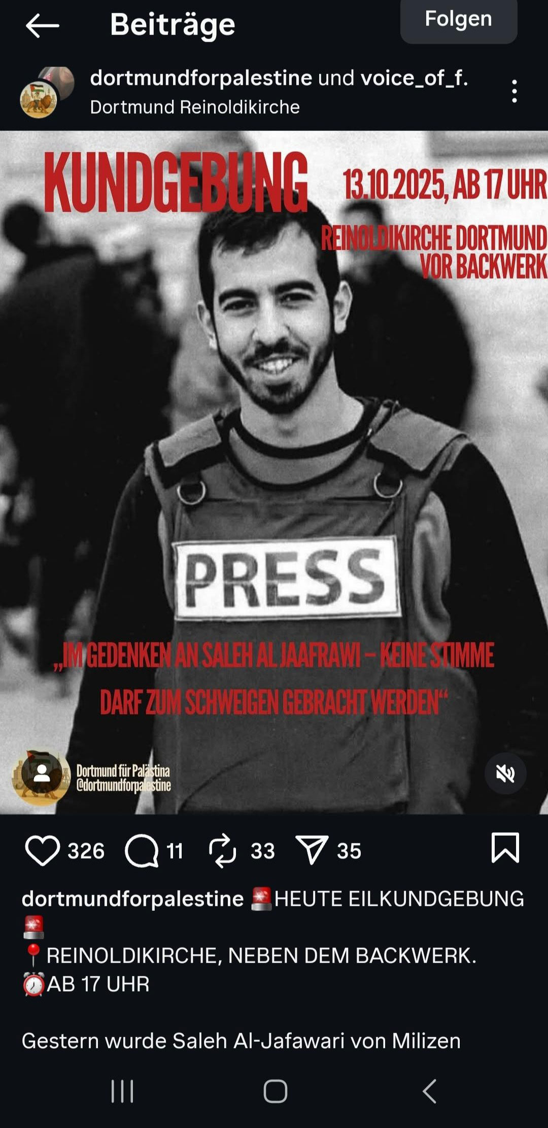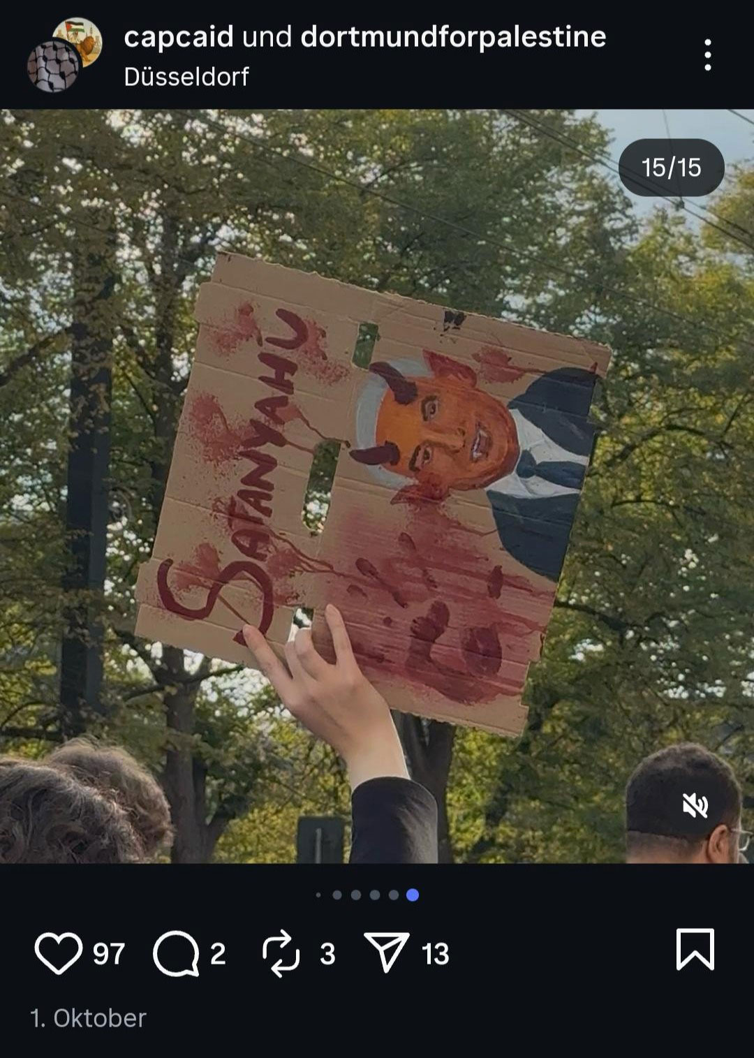 Doch nicht nur in der Ausstellung selbst haben fragwürdige Personen ihre Bilder ausstellen können, auch das Begleitprogramm wurde offenbar zumindest teilweise von Initiativen mitgestalten, die in der Vergangenheit durch die Verwendung antisemitischer Bildsprache aufgefallen ist. Ein Vortrag mit dem Titel „Kunst & Widerstand“ wurde offenbar von der Initiative „Dortmund for Palestine“ organisiert, zumindest legen dies Screenshots von deren Instagram-Seite nahe. Die Initiative fällt schon seit längerem damit auf, dass sie auf ihren „pro-palästinensischen“ Kundgebungen und Demonstrationen antisemitische Bildsprache und Symbole nutzen. So veröffentlichten sie von einer „pro-palästinensischen“ Demonstration in Düsseldorf am 27.09.2025 u.a. Bilder, auf denen die Intifada glorifiziert wird oder der israelische Ministerpräsident Netanjahu als Satan dargestellt wird („Satanyahu“).[1] Zuletzt ist die Initiative damit aufgefallen, dass sie eine Kundgebung zu Ehren von Saleh Al-Jafawari („Mr. Fafo“) an der Reinoldikirche veranstaltet hat. Der als Hamas-Propagandist bekannte Influencer war bei einer innerpalästinensischen Auseinandersetzung zwischen der Hamas und einer palästinensischen Miliz getötet worden. Er wurde weltweit bekannt durch ein Video, in dem er den 7. Oktober als „schönsten Tag seines Lebens“ bejubelt.[2]