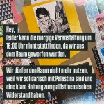 Die kurzfristige Ankündigung des Kurzfilms „Palästina in unseren Stimmen“ am Sonntagabend führte schließlich zum Abbruch des eigentlich bis zum 22.10. geplanten Programms durch die Betreiber des Rekorder II. In dem Ankündigungstext der Filmvorführung lassen das Veranstaltungskollektiv verlauten, dass sie sich mit dem „palästinensischen Widerstand in all seinen Formen“ solidarisieren. Dies kann nach dem 7. Oktober 2023, dem größten Pogrom an Jüdinnen und Juden seit der Shoah, nicht anders interpretiert werden, als dass auch Terrorismus und jede Form von Gewalt gegen Israelis und Israelinnen als „palästinensischer Widerstand“ begrüßt wird. Die Recherche über die ausstellenden Künstler, deren Kunstwerke sowie über die Organisatorn des Rahmenprogramms bestätigen diesen Eindruck.