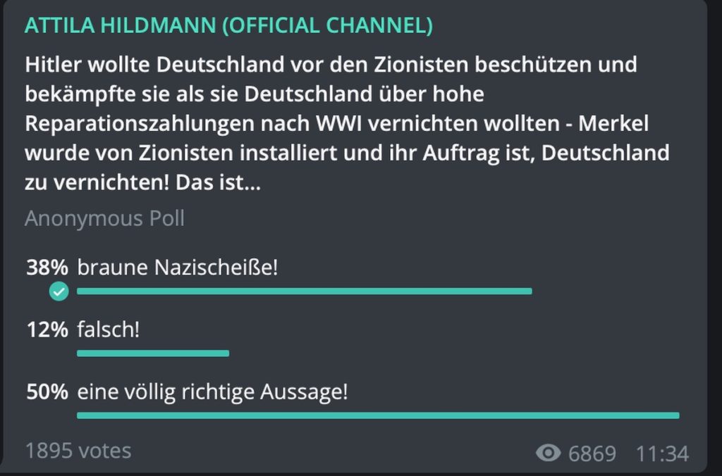Eine positive Meldung zum Telegram-Kanal von Attila Hildmann gibt es zu vermelden: Seine 60000 Follower – das ist die Anzahl der Menschen die seinen Telegram-Kanal abonniert haben – sind nicht alle durchgeknallte Nazis oder sonstige Irre. Ein Großteil folgt ihm vermutlich inzwischen aus Unterhaltung- und Informationsgründen. Die Antwort auf die Frage, ob Attila Hildmann ein gut geplantes Projekt von Martin Sonneborn ist: Sie ist weiterhin offen.