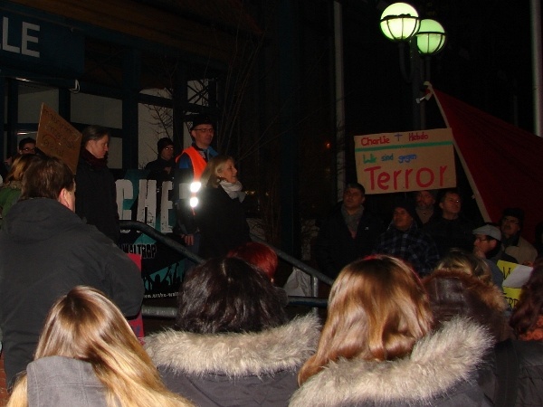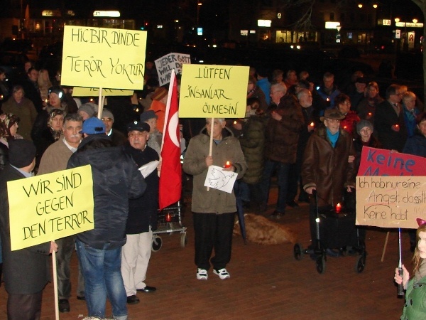 Auch Bürgermeisterin Nicole Moenikes (CDU), welche sich mit ihrer Familie ebenfalls unter den Anwesenden auf dem Marktplatz befand, dem Aufruf im Internet offensichtlich ebenso gefolgt war, richtete spontan ein paar kurze, improvisierte Worte (leider ohne technische Verstärkung, was es einigen Anwesenden unmöglich machte sie zu verstehen) an die versammelten Mitbürger, zeigte sich darin stolz auf das an diesem Abend nach Außen deutlich sichtbar gesendete Zeichen im Sinne einer möglichst toleranten und vielschichtigen Gesellschaft in der sonst häufig eher beschaulichen 29.000-Einwohner Stadt.
