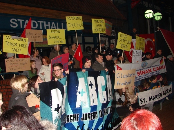 Nachdem im Internet kurzfristig ein entsprechender Aufruf kursierte, trafen sich z.B. am gestrigen Samstag in Waltrop, im Kreis Recklinghausen, gut 150 engagierte Bürger vor der örtlichen Stadthalle unter dem etwas ungelenk klingenden Motto: „Waltrop gegen Terrorismus, Rassismus und für die freie Glaubensrichtung“.