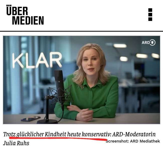 Julia Ruhs ist eine ziemlich normale Frau Anfang dreißig. Sie ist in Baden-Württemberg in einer, wie sie selbst sagt, „stinknormalen Familie“ aufgewachsen und hatte eine glückliche Kindheit. Nach einem normalen journalistischen Werdegang hat sie es in nur drei Jahren von einer Volontärin beim Bayerischen Rundfunk zur Autorin einer eigenen Focus Online-Kolumne und zur Moderatorin einer eigenen Politiksendung im Öffentlich-rechtlichen Rundfunk (ÖRR) geschafft. Ihr Buch Links-grüne Meinungsmacht. Die Spaltung unseres Landes, das ich hier kurz vorstellen möchte, hat das Zeug zum Bestseller. Weil Julia Ruhs eine ganz normale Meinung vertritt.