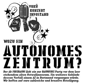 Es würde sogar die Stadt Dortmund davon profitieren, wenn an diesem Ort, Raum für emanzipatorischen, kreativen Inhalt geschaffen würde. Diesen Platz gibt es in der selbst ernannten „Westfalenmetropole“ (noch) nicht. Niedrigschwellige Angebote, ähnlich dem AZ Mühlheim könnten die Trostlosigkeit städtischer Kreativobjekte mildern. In dieser Stadt gibt es nur Raum, wenn die Brieftasche gezückt wird und das ist zwar einem Wollen von Kulturhauptstadthäuptlingen genehm, bedeutet langfristig jedoch den Untergang freier Kreativität. Also: Hingehen, hinhören, das Fest genießen. Findet im Übrigen nicht heute, sondern Samstag, den 07.08 ab 16:00 Uhr statt.