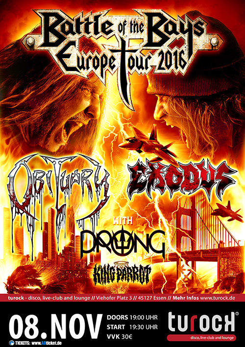 Jahrzehntelang haben die Fans auf dieses Package gewartet: Erstmalig in ihrer Karriere kommen die beiden Thrash und Death Metal-Urgesteine Obituary und Exodus unter dem Banner „Battle Of The Bays“ im Herbst 2016 nach Deutschland. Mit von der Partie sind außerdem die Industrial/Groove-Metaller Prong, sowie die australischen Thrash Grinder King Parrot. Das Quartett hat fünf Shows im Oktober/November 2016 bestätigt.