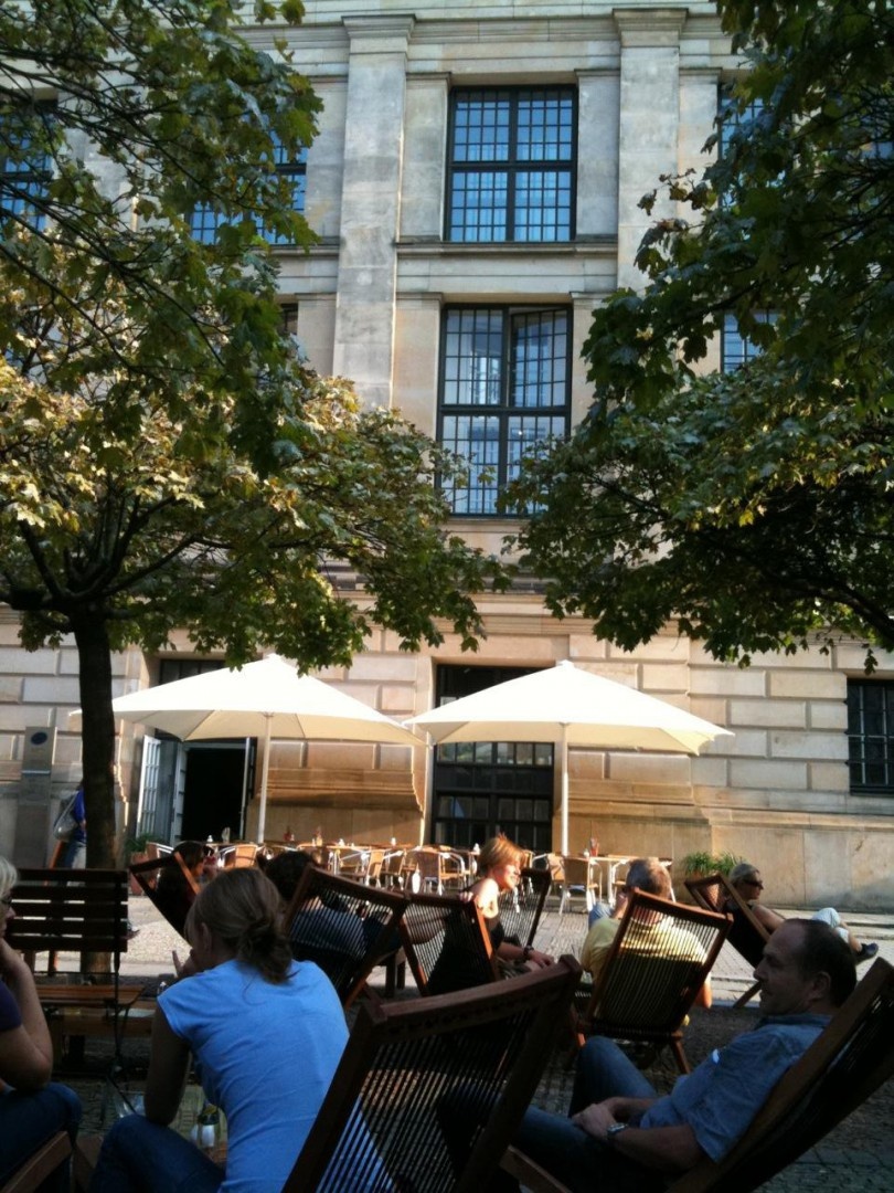 Als wir wieder ins Freie treten, trifft uns die Abendhitze hart. Wir flanieren trotzdem noch bis zum Gendarmenmarkt, setzen uns draußen ins Café zwischen Französischem Dom und Konzerthaus. Espresso. Im Konzerthaus stehen zwei Türen offen, ein Chor probt.