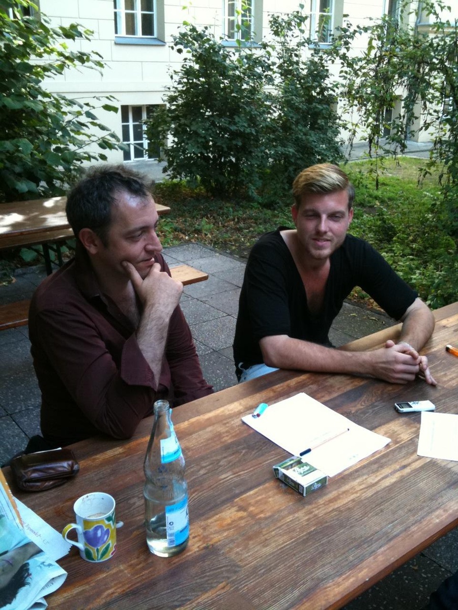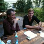 Der Garten ist leer bis auf ein paar Techniker und einen kleinen Vierertrupp. Ich sage zu B.: „Den kenne ich. Das ist doch Rainald Grebe!?“ Obwohl ich mir eigentlich sicher bin, googelt B. den Grebe auf dem iPhone, schaut Fotos, ja, er isses. Hab ich doch gesagt, sage ich, erkenn ich an der Stimme. Am 31. August gibt’s im Gorki eine Grebe-Premiere: „Völker schaut auf diese Stadt. Berlin wählt und Rainald Grebe kann sich nicht entscheiden.“