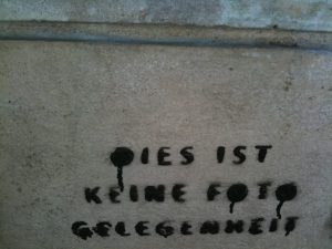 Apropos ‚Vergänglichkeit‘: An der Rathausstraße kurz vorm Spreeufer steht auch das Marx-Engels-Denkmal. Es zeigt in „etwa doppelter Lebensgröße auf flacher Sockelplatte die Begründer des wissenschaftlichen Sozialismus: Karl Marx, auf einem Quader sitzend und die Hände auf die Knie gelegt, und Friedrich Engels, daneben stehend, beide den Blick nach vorn gerichtet“. Die Plastik steht unter Denkmalschutz. Kurz danach, direkt am Ufer der Spree, hat jemand ein Stencil auf Stein gesprüht: „Dies ist keine Fotogelegenheit“. Eigentlich hätte mich das aufmerksam machen sollen, auf das, was noch kam.