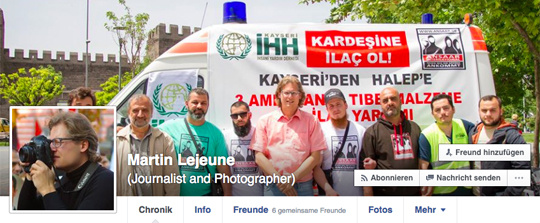 Martin Lejeune begleitete als Reporter einen Hilfskonvoi für Syrien bis an die türkisch-syrische Grenze. Nachdem der Transport in Aleppo eingetroffen ist, postet Lejeune begeistert: „Für mich sind diese Menschen Helden der Menschlichkeit“. Obwohl der Verein mit bekannten Salafistenpredigern eng zusammenarbeitet und gute Kontakte zum Islamisten-Promi Pierre Vogel pflegt, hat sich Lejeune den Hilfsverein nach seinen Worten bewusst ausgesucht. Viele Probleme in der Welt würden durch „informelle Reiche“ verursacht, so Lejeune. Er sagt: „Das ist ein System der internationalen Ausbeutung. Deswegen finde ich gut, dass Organisationen wie Ansaar dagegen arbeiten.“