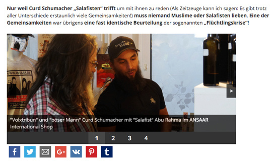 @Jörg Crölsmann: Sie sind ja selbst vor 9 Monaten mit Ansaar nach Syrien gereist. Die Reise wurde ihnen großzügig von Ansaar bezahlt. Das ist doch schon ein bisschen mehr, als "miteinander reden", nicht wahr. Man sieht sie Arm in Arm mit einem Ansaar Mitarbeiter, der mit dem Salafisten Pierre Vogel Street-Dawah betrieben hat. Bei Kosta TV rufen Sie zur Unterstützung von Ansaar auf. Da darf man sich fragen, ob ihnen möglicherweise die notwendige Distanz zu Salafisten fehlt?