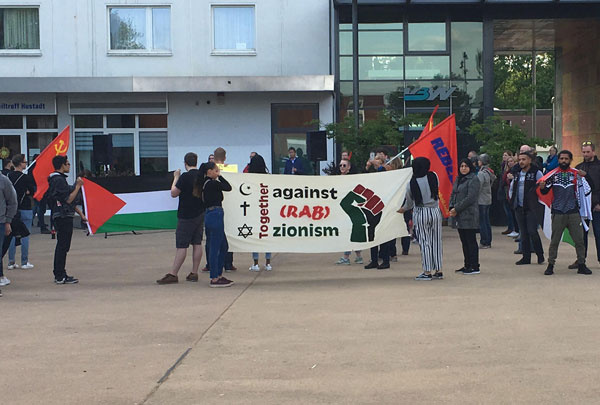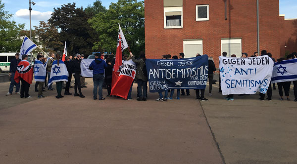 Ihnen gegenüber standen rund 80 Teilnehmer einer israelsolidarischen Kundgebung. Auch hier waren Mitglieder der Linkspartei-Jugend Solid, die sich für Israel und gegen ihren eigenen Jugendverband stellten. Neben weiteren Anhängern der Jusos und der Grünen Jugend nahmen auch Menschen an der Veranstaltung unter dem Motto „Gegen jeden Antisemitismus – Solidarität mit Israel“ teil, die keiner Partei oder Organisation angehören, aber ein Zeichen gegen Antisemitismus setzen wollten. Mehrere Menschen trugen zudem eine Kippa.