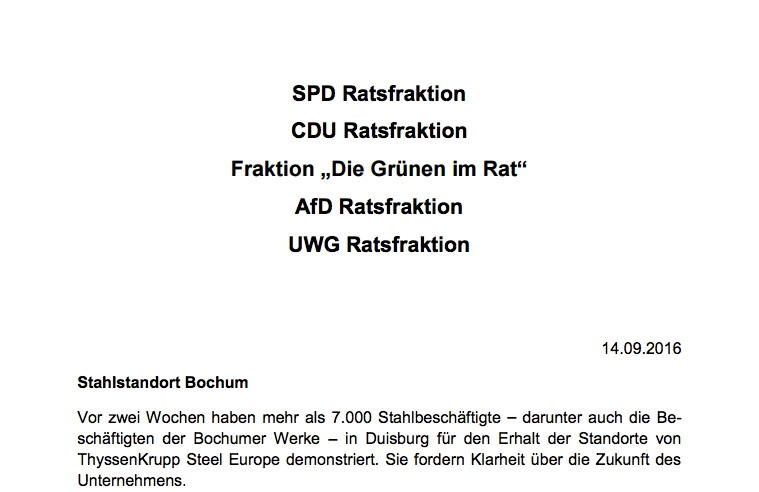 Die Parteien in Bochum sorgen sich um den Stahlstandort Bochum – oder tun zumindest so, denn sowohl die Klimapolitik als auch die Umweltpolitik in Europa und im Bund, die von SPD, CDU und Grünen in weiten Teilen mitgetragen werden, stellen energie- und rohstoffintensive Industrien wie die Stahlindustrie vor Problemen. Ein gemeinsamer Antrag über die Fraktionsgrenzen hinweg mit dem Tenor „Der Bochumer Rat bekennt sich zum Stahlstandort Bochum und fordert den Erhalt der Bochumer Werke“ ist also nicht viel mehr als eine Mischung aus PR und Folklore. Politische Bedeutung hat er nicht. Und er wurde im Rat auch angenommen. Umso erstaunlicher, das SPD und Grüne, die ja auch oft Proteste gegen die AfD unterstützen und die Partei mindestens als rechtspopulistisch geißeln, nun mit der AfD einen gemeinsame Antrag in den Rat eingebracht haben. Die AfD kann sich nun über die ungewohnte Anerkennung freuen – Grüne, CDU und SPD werden es von nun an etwas schwerer haben, sich von ihrem neuen Partner zu distanzieren.