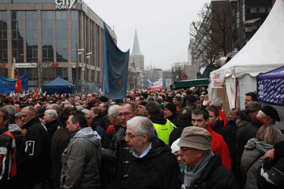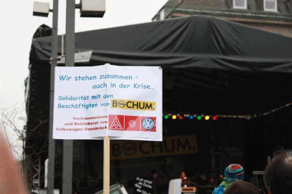An die zehntausend Menschen am Sonntag Mittag in der gesamten Bochumer Innenstadt zusammengekommen, um Solidarität mit dem Opel-Werk zu demonstrieren. Obwohl die Verhandlungen über die Zukunft des Werkes in der Vergangenen Woche eine Garantie des Standortes bis zum, Jahr 2016 erbrachten, haben sich Tausende rund um das Rathaus und den Massenberg Boulevard versammelt. Veranstalter des Solidaritätsfest, das eine Mischung aus Protest gegen die lange Zeit drohende Werkschließung und ein Ersatz für die im vergangenen Jahr von Opel-Mutter General Motors abgesagte Feier zum 50jährigen Jubiläum des Bochumer Werkes ist, ist die IG Metall. Unterstützt wurde die Aktion unter anderem von der Stadt, der IHK-Bochum, dem Schauspielhaus und zahlreichen Initiativen, Kaufleuten und Verbänden.