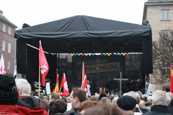 An die zehntausend Menschen am Sonntag Mittag in der gesamten Bochumer Innenstadt zusammengekommen, um Solidarität mit dem Opel-Werk zu demonstrieren. Obwohl die Verhandlungen über die Zukunft des Werkes in der Vergangenen Woche eine Garantie des Standortes bis zum, Jahr 2016 erbrachten, haben sich Tausende rund um das Rathaus und den Massenberg Boulevard versammelt. Veranstalter des Solidaritätsfest, das eine Mischung aus Protest gegen die lange Zeit drohende Werkschließung und ein Ersatz für die im vergangenen Jahr von Opel-Mutter General Motors abgesagte Feier zum 50jährigen Jubiläum des Bochumer Werkes ist, ist die IG Metall. Unterstützt wurde die Aktion unter anderem von der Stadt, der IHK-Bochum, dem Schauspielhaus und zahlreichen Initiativen, Kaufleuten und Verbänden.