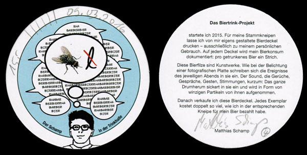 Kunst und Alkohol sind schon oft eine fruchtbare Beziehung eingegangen. Eine neue Variante dieser alten Liebe spielt nun der Bochumer KünstlerMatthias Schamp: Er lässt sich für das Bier trinken bezahlen: Die Deckel, der in den Bochumer Kneipen Goldkante, Trinkhalle und Freibeuter erzecht, können als Kunstwerke für das doppelte der Deckelsumme erstanden werden.