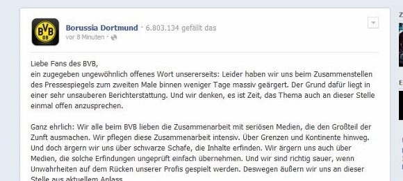 Nun reicht es dem Verantwortlichen des Clubs offenbar. In einem ungewöhnlichen Schritt hat man vor wenigen Minuten über Facebook seiner Verärgerung über einige Berichte der letzten Tage offensiv Luft gemacht. Man spricht bei der Borussia in diesem Zusammenhang u.a. von ‚unsauberer Berichterstattung‘. :