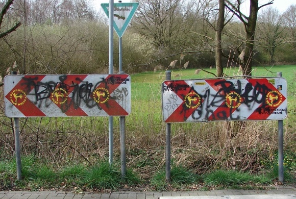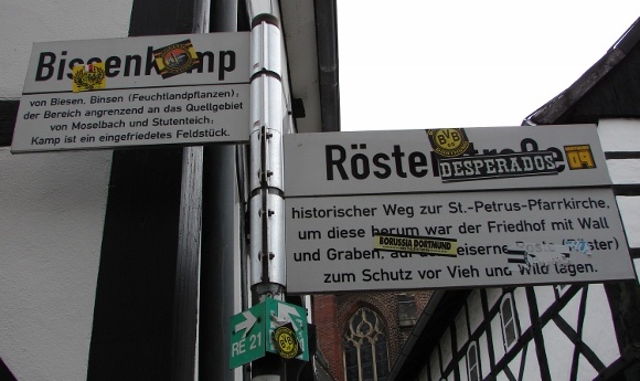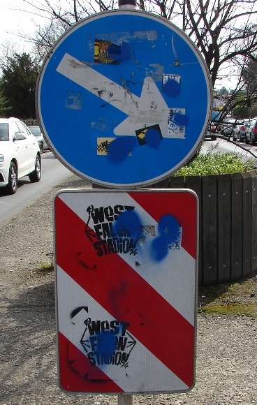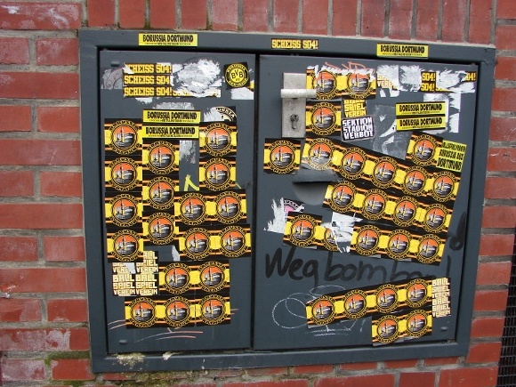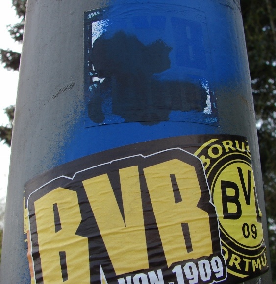 In meinem Wohnort, in Waltrop, liefern sich beispielsweise fanatische Anhänger der beiden Revierclubs seit Monaten schon eine ‚beinharte‘ Auseinandersetzung um die Vorherrschaft hier im Revier auf den Straßen der Stadt. Allerdings eben nicht mit Fäusten, sondern mit Aufklebern und Farb-Sprühdosen.
