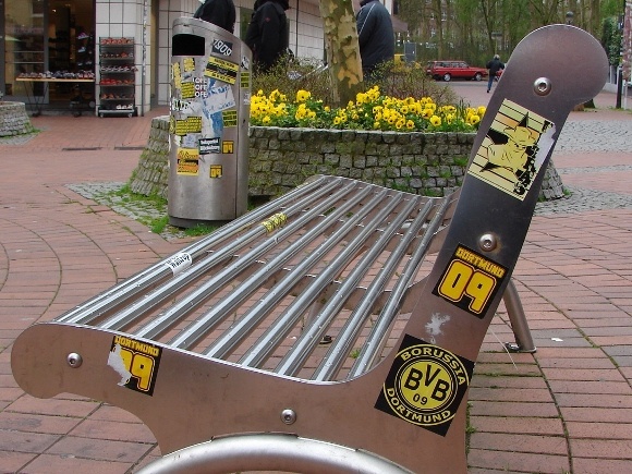 Der auf dem ersten Foto abgebildete Mülleimer mit den wirklich total akkurat nebeneinander aufgeklebten gelben BVB-Logos auf blauem Grund sieht für mich aus wie die Starwarsfigur R2D2 in einem von Andy Warhol designten T-Shirt, nur halt mit BVB statt Marilyn Monroe und auf wesentlich weniger Farben reduziert.